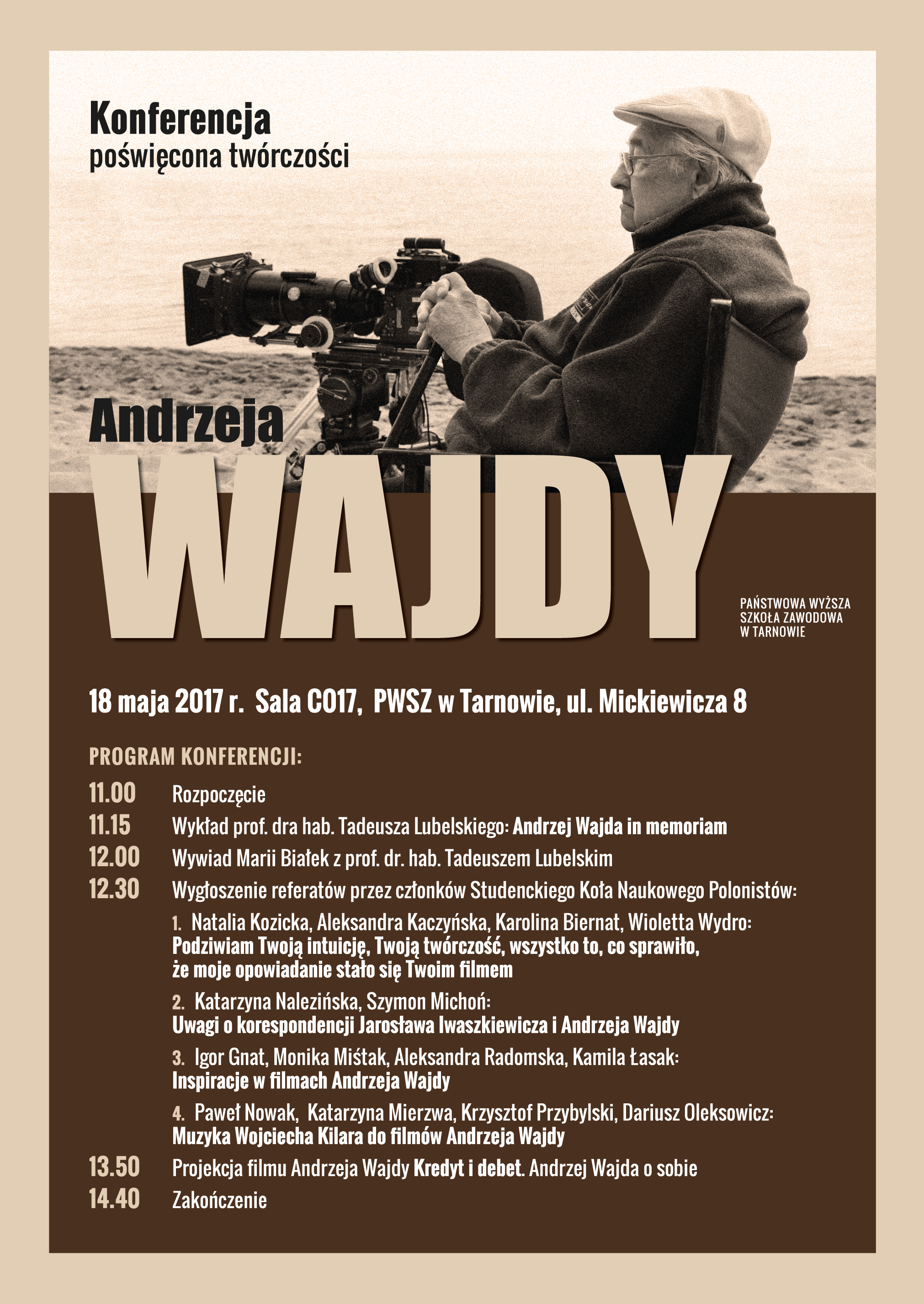 Dyrektor Instytutu Humanistycznego Państwowej Wyższej Szkoły Zawodowej w Tarnowie, Kierownik Zakładu Filologii Polskiej oraz Studenckie Koło Naukowe Polonistów zapraszają wszystkich zainteresowanych na konferencję poświęconą twórczości Andrzeja Wajdy, która odbędzie się 18 maja 2017 roku w auli PWSZ w Tarnowie (C017).