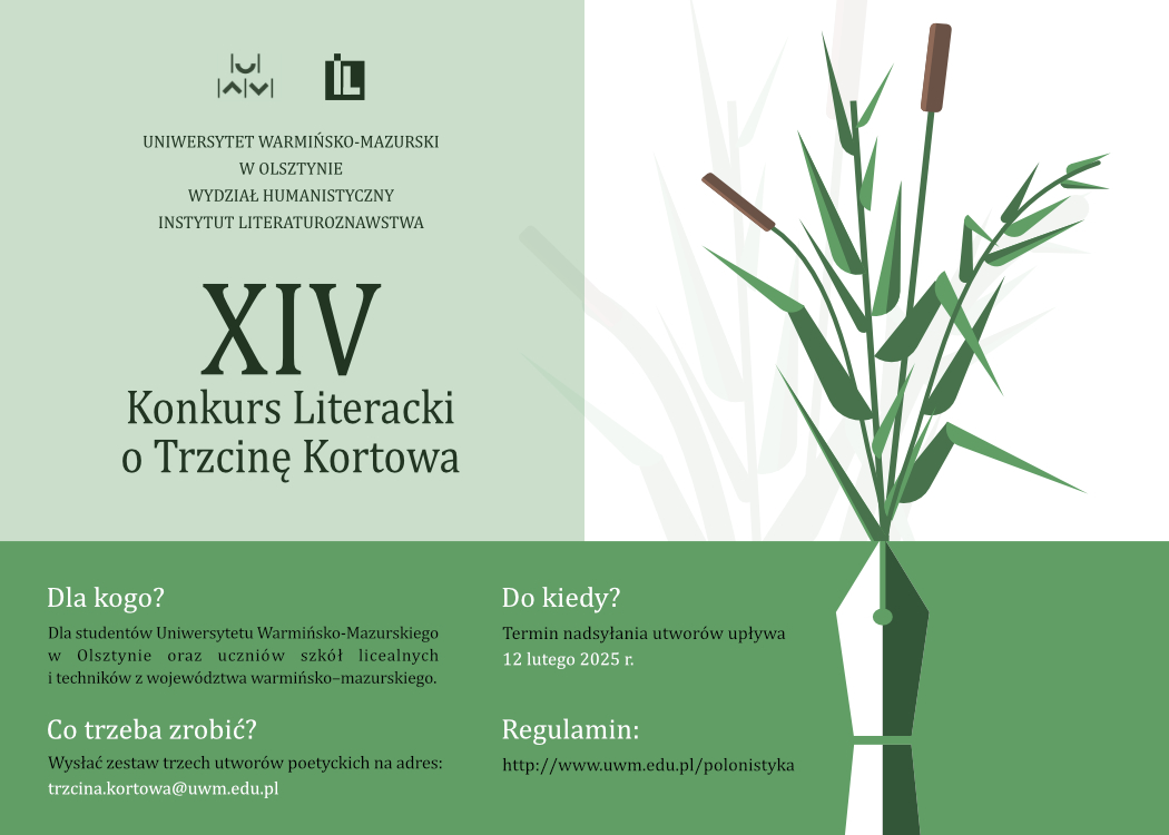Katedra Literatury Polskiej Instytutu Literaturoznawstwa UWM w Olsztynie zaprasza do udziału w XIII edycji „Konkursu Literackiego o Trzcinę Kortowa”. Jest on skierowany zarówno do uczniów szkół ponadpodstawowych naszego województwa, jak i do studentów Uniwersytetu Warmińsko-Mazurskiego w Olsztynie. Na zestaw trzech wierszy czekamy do 6 lutego 2024 r. Zgłoszenia należy przesyłać pocztą elektroniczną na adres: trzcina.kortowa@uwm.edu.pl. Wyniki zostaną oficjalnie ogłoszone podczas obchodów Dnia Języka Ojczystego, które odbędą się 21 lutego 2024 r. na Wydziale Humanistycznym UWM w Olsztynie (ul. K. Obitza 1).