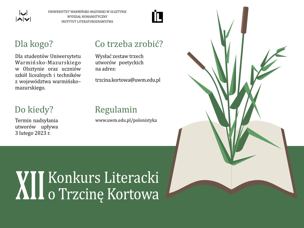 Katedra Literatury Polskiej Instytutu Literaturoznawstwa UWM w Olsztynie zaprasza do udziału w XIII edycji „Konkursu Literackiego o Trzcinę Kortowa”. Jest on skierowany zarówno do uczniów szkół ponadpodstawowych naszego województwa, jak i do studentów Uniwersytetu Warmińsko-Mazurskiego w Olsztynie. Na zestaw trzech wierszy czekamy do 6 lutego 2024 r. Zgłoszenia należy przesyłać pocztą elektroniczną na adres: trzcina.kortowa@uwm.edu.pl. Wyniki zostaną oficjalnie ogłoszone podczas obchodów Dnia Języka Ojczystego, które odbędą się 21 lutego 2024 r. na Wydziale Humanistycznym UWM w Olsztynie (ul. K. Obitza 1).