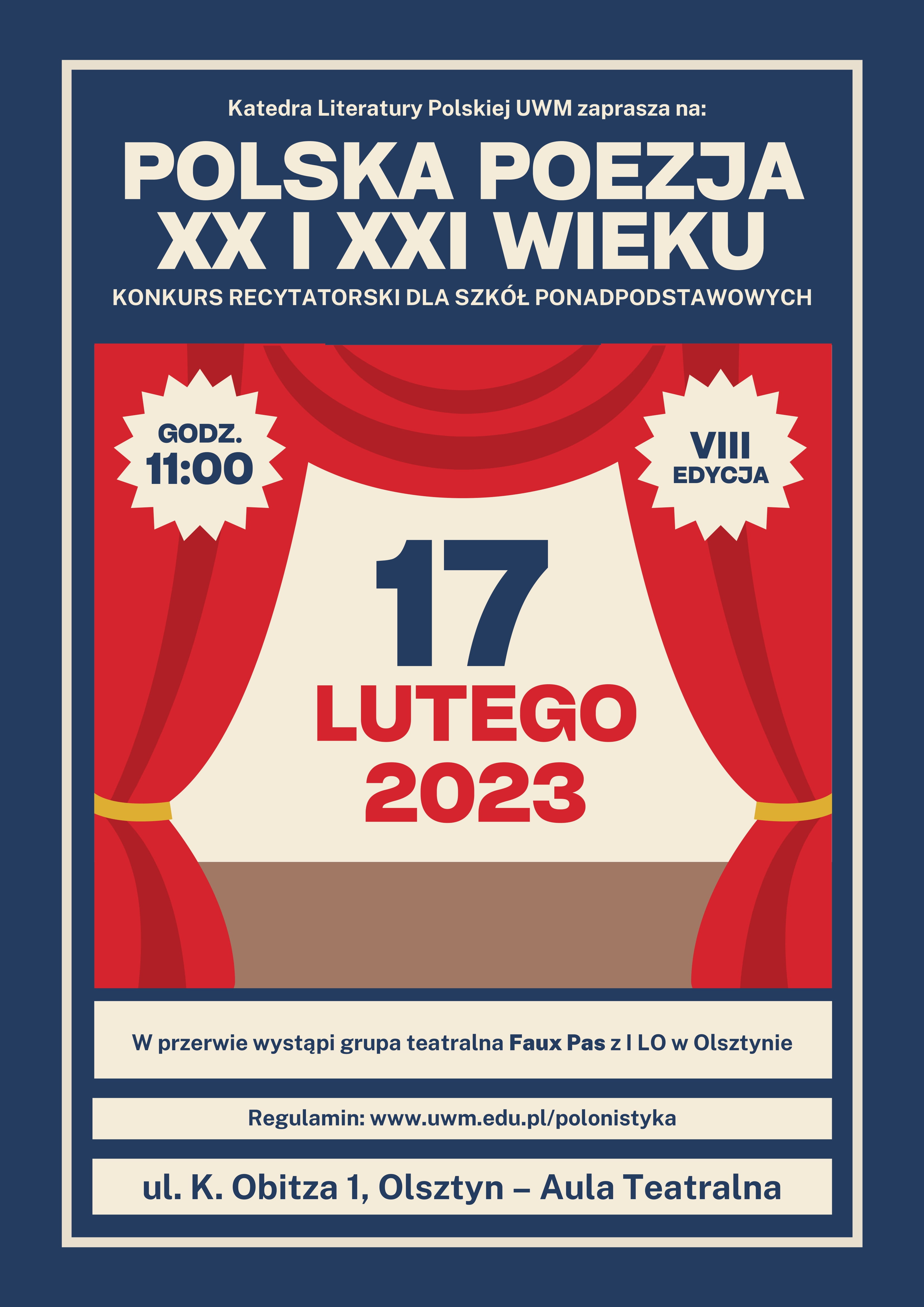 2) konkurs odbędzie się w Katedrze Literatury Polskiej UWM, przy ul. Kurta Obitza 1, w budynku Centrum Humanistycznego, w Auli Teatralnej, dnia 17 lutego 2023 r., o godz. 11:00.
