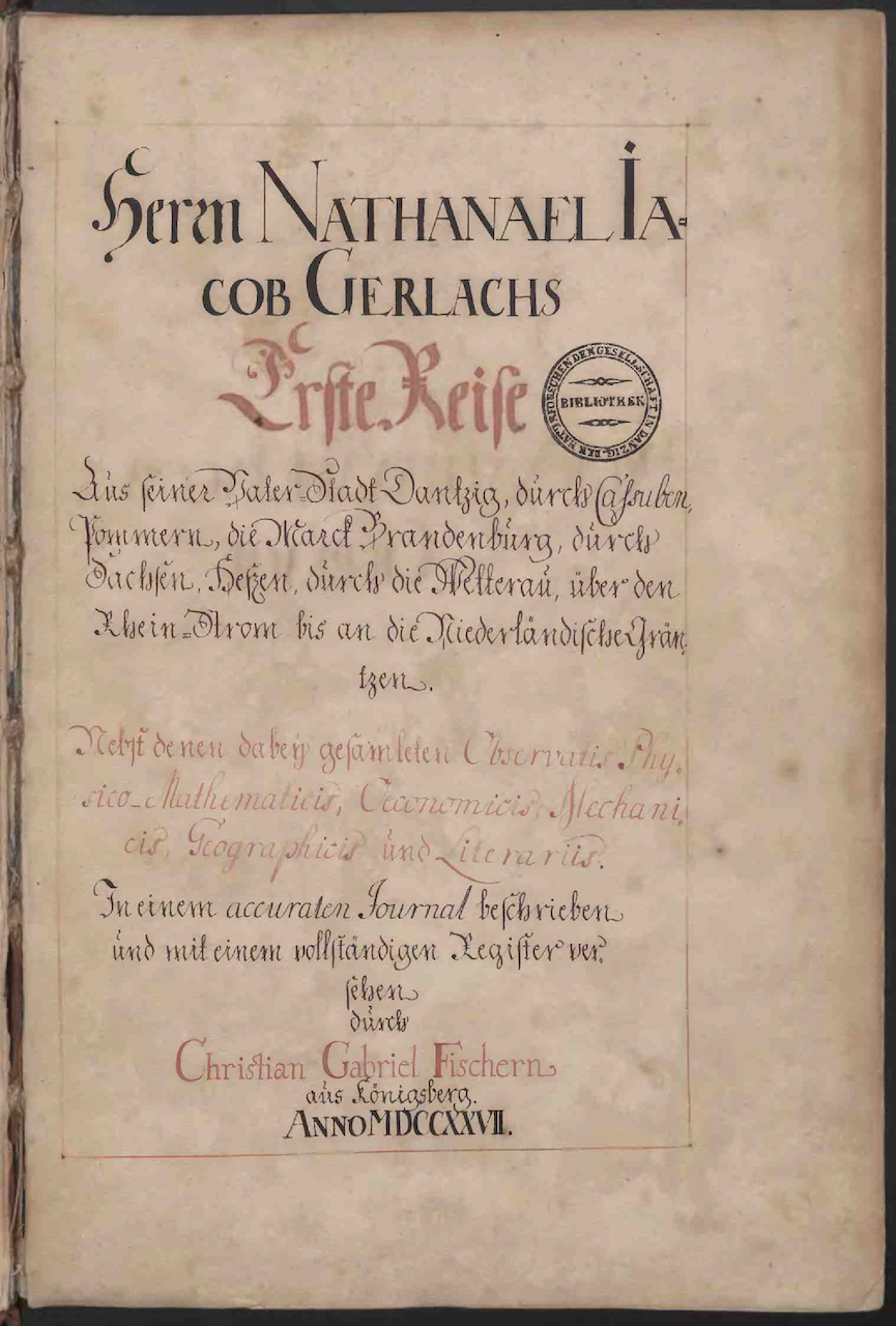 Od lipca 2020 roku w ramach programu Medialab Gdańsk Instytutu Kultury Miejskiej trwają prace nad odczytaniem i przetłumaczeniem dziennika podróży Nathaneala Jacoba Gerlacha po Europie, który został spisany przez towarzyszącego mu w podróży Christiana Gabriela Fischera. Dziennik dokumentuje podróż, która odbyła się w latach 1727-1730, a jej pierwszy etap przebiegał z Gdańska przez Kaszuby, Pomorze, Branderburgię, Saksonię, Hesję aż do Renu i granic Niderlandów. W zasobie Biblioteki Politechniki Gdańskiej zachowało się 8 tomów dzienników zawierających liczne opisy ówczesnego świata: fauny, flory, ale też matematyki, maszyn, ekonomii i literatury. Spisano je ręcznie, w języku niemieckim, za pomocą pisma neogotyckiego.
