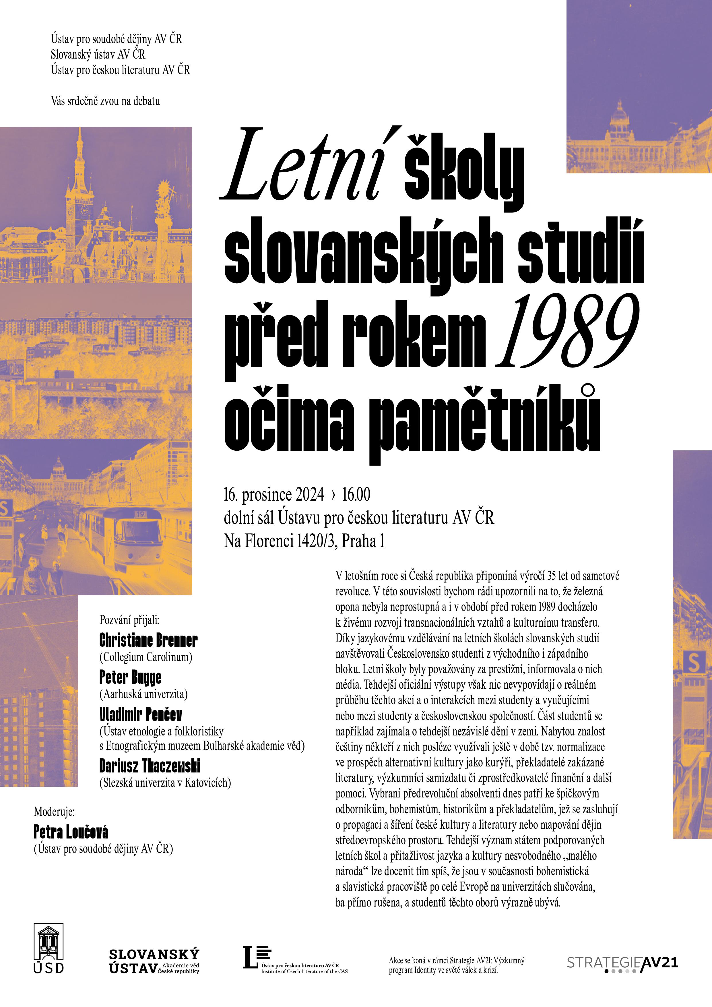 Instytut Historii Współczesnej (Ústav pro soudobé dějiny AV ČR, v. v. i.), Instytut Slawistyki (Slovanský ústav AV ČR, v. v. i.) oraz Instytut Literatury Czeskiej (Ústav pro českou literaturu AV ČR, v. v. i.) Akademii Nauk Republiki Czeskiej zapraszają serdecznie na debatę "Letnie szkoły studiów słowiańskich przed rokiem 1989 w oczach ich uczestników".