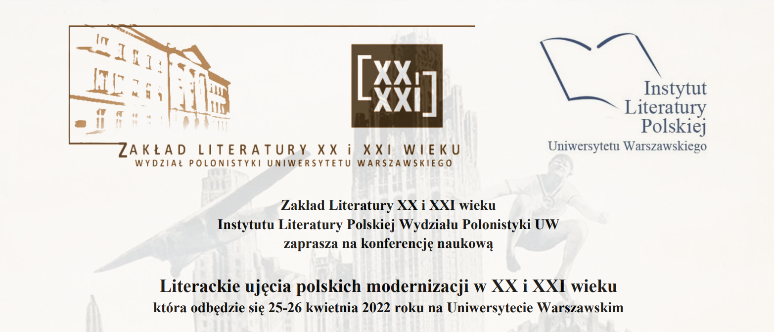 Zakład Literatury XX i XXI wieku Instytutu Literatury Polskiej Wydziału Polonistyki UW zaprasza na konferencję naukową Literackie ujęcia polskich modernizacji w XX i XXI wieku, która odbędzie się 25-26 kwietnia 2022 roku na Uniwersytecie Warszawskim.
