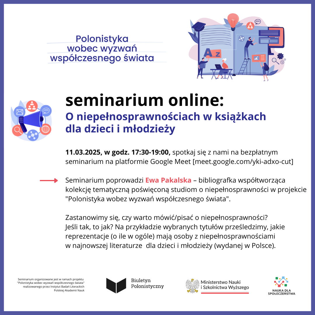 We wtorek 11 marca 2025 roku w godz. 17:30-19.00 odbędzie się kolejne otwarte seminarium online "O niepełnosprawnościach w książkach dla dzieci i młodzieży", które poprowadzi Ewa Pakalska – bibliografka współtworząca kolekcję tematyczną poświęconą studiom o niepełnosprawności w projekcie "Polonistyka wobec wyzwań współczesnego świata".
