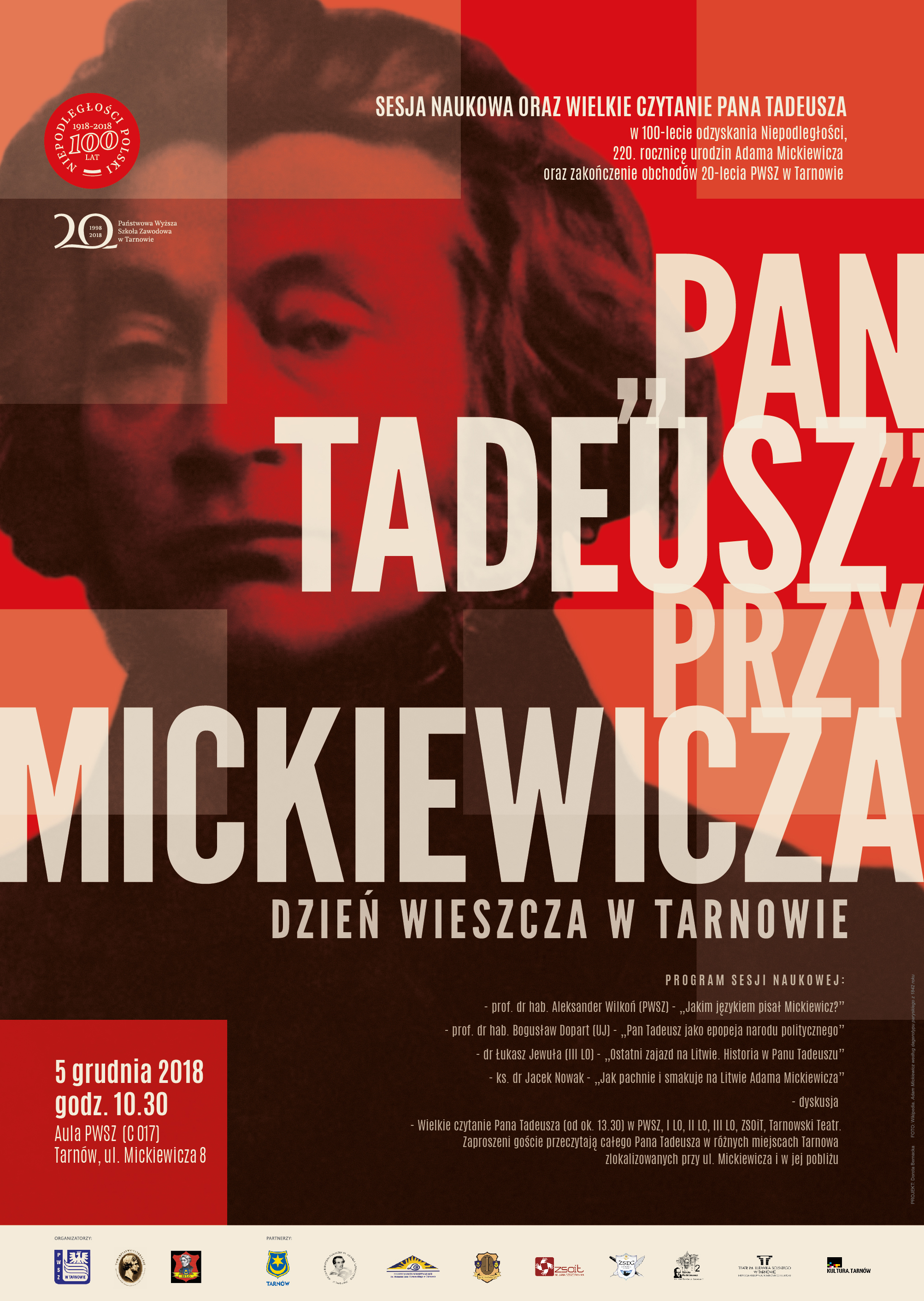 Towarzystwo Literackie im. Adama Mickiewicza, III Liceum Ogólnokształcące w Tarnowie oraz Państwowa Wyższa Szkoła Zawodowa w Tarnowie zapraszają na „Pana Tadeusza przy Mickiewicza – dzień Wieszcza w Tarnowie” – w 100-lecie odzyskania niepodległości i 220. rocznicę urodzin Adama Mickiewicza.