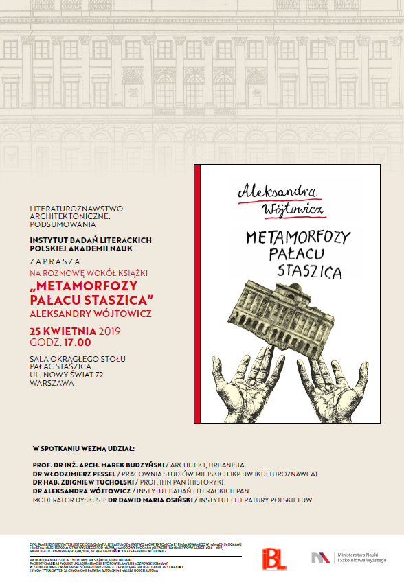 Grupa badawcza realizująca grant „Literaturoznawstwo architektoniczne” zaprasza na panel dyskusyjny poświęcony książce Metamorfozy Pałacu Staszica dr Aleksandry Wójtowicz, który odbędzie się w czwartek 25 kwietnia, o godz. 17.00, w Sali Okrągłego Stołu w Pałacu Staszica.
