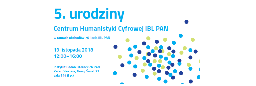 Centrum Humanistyki Cyfrowej Instytutu Badań Literackich PAN serdecznie zaprasza na swoje piąte urodziny, które odbędą się w poniedziałek, 19 listopada 2018 w godzinach 12:00-16:00 w Instytucie Badań Literackich PAN (Pałac Staszica, Nowy Świat 72, sala 144, I piętro). Tematem przewodnim wystąpień będzie problematyka nawiązywania współpracy z badaczami niekorzystającymi jeszcze z metod cyfrowych.