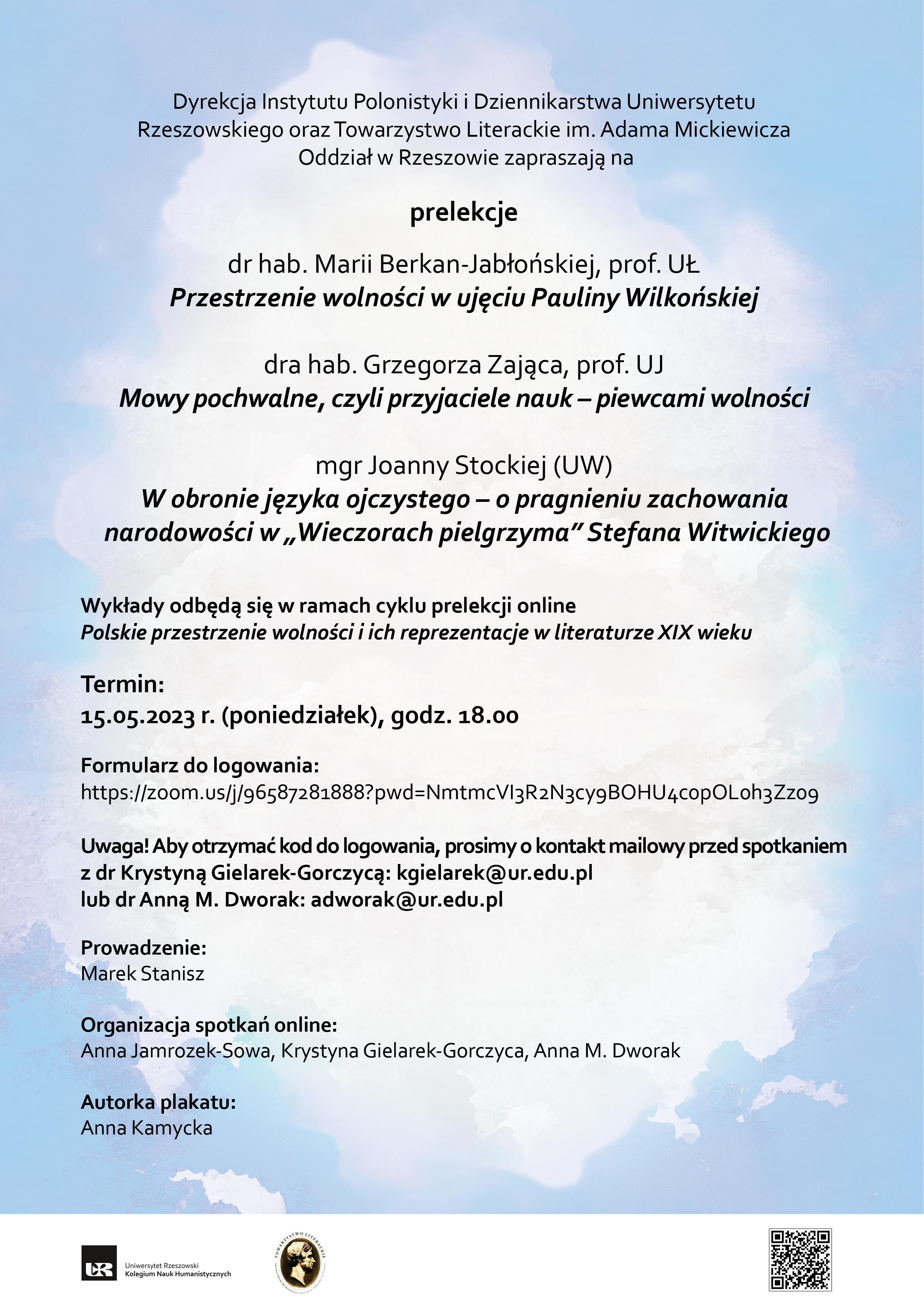 Dyrekcja Instytutu Polonistyki i Dziennikarstwa Uniwersytetu Rzeszowskiego oraz Towarzystwo Literackie im. Adama Mickiewicza oddział w Rzeszowie zapraszają na cykl prelekcji online Polskie przestrzenie wolności i ich reprezentacje w literaturze XIX wieku.