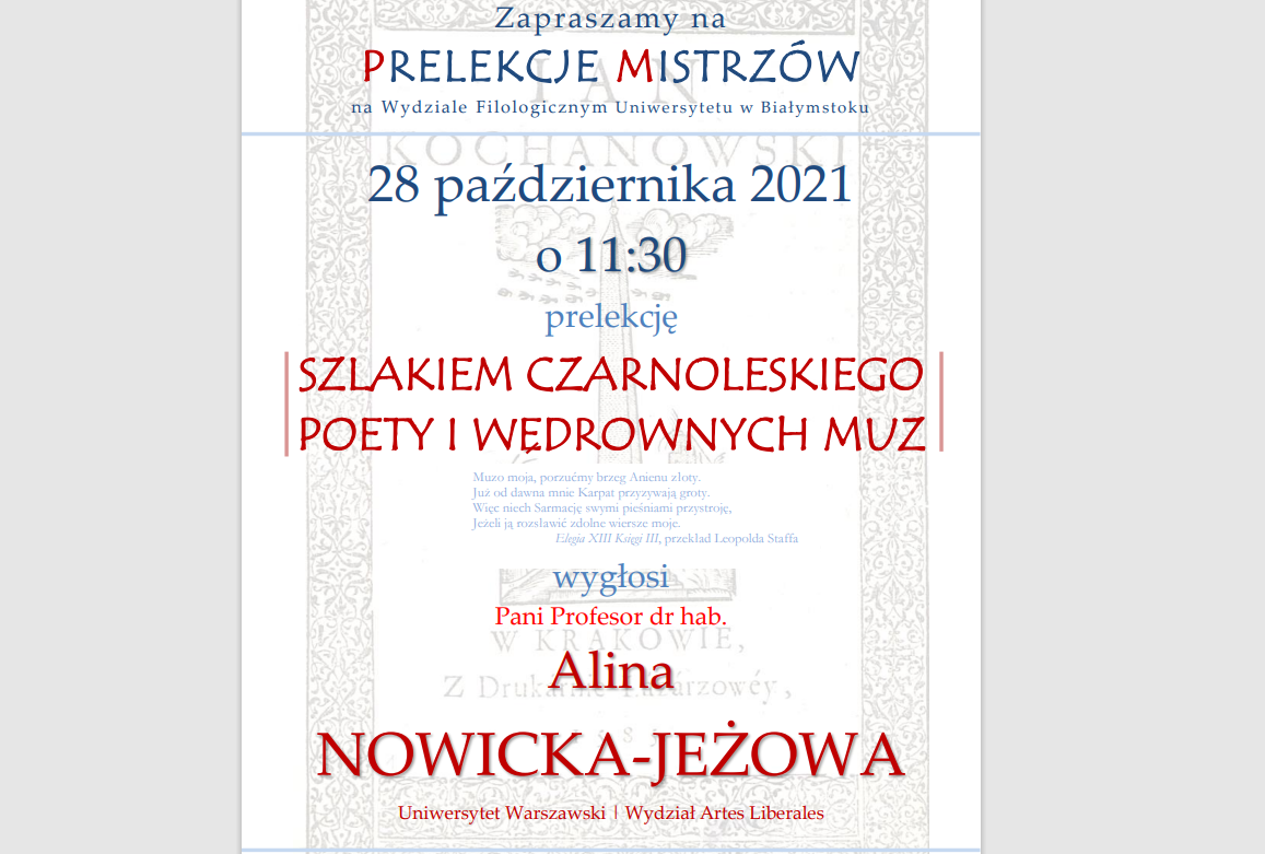 Wydział Filologiczny Uniwersytetu w Białymstoku zaprasza do wysłuchania Prelekcji Mistrzowskiej o Janie Kochanowskim Pani prof. Aliny Nowickiej-Jeżowej, jednej z najwybitniejszych znawczyń kultury i literatury staropolskiej.