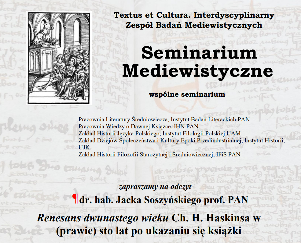 Prof. Jacek Soszyński (Instytut Historii Nauki PAN), "Renesans dwunastego wieku" Ch. H. Haskinsa w (prawie) sto lat po ukazaniu się książki / odczyt w ramach "Seminarium Mediewistycznego"