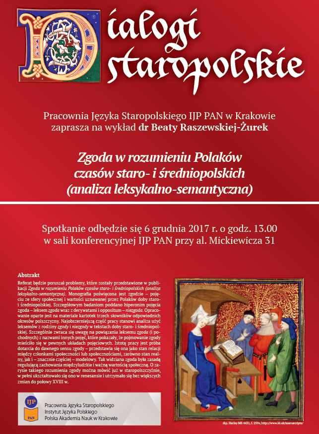 Pracownia Języka Staropolskiego Instytutu Języka Polskiego PAN zaprasza na trzecie spotkanie z cyklu "Dialogi staropolskie". Naszym gościem będzie dr Beata Raszewska-Żurek, która wygłosi referat pt. „Zgoda w rozumieniu Polaków czasów staro- i średniopolskich (analiza leksykalno-semantyczna)”.