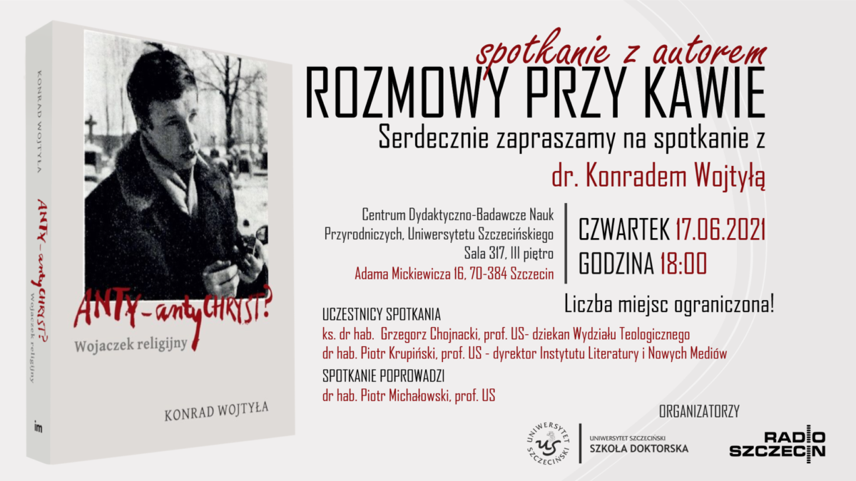 ”Spotkanie z Autorem – Rozmowy przy Kawie” – to nowy cykl spotkań organizowany przez Szkołę Doktorską Uniwersytetu Szczecińskiego .Gościem specjalnym będzie dr Konrad Wojtyła autor książki „Anty-antychryst? Wojaczek religijny”. Spotkanie obędzie w dniu 17.06.2021 godz. 18:00 w Centrum Dydaktyczno – Badawczym Nauk Przyrodniczych US sala 317, III piętro.