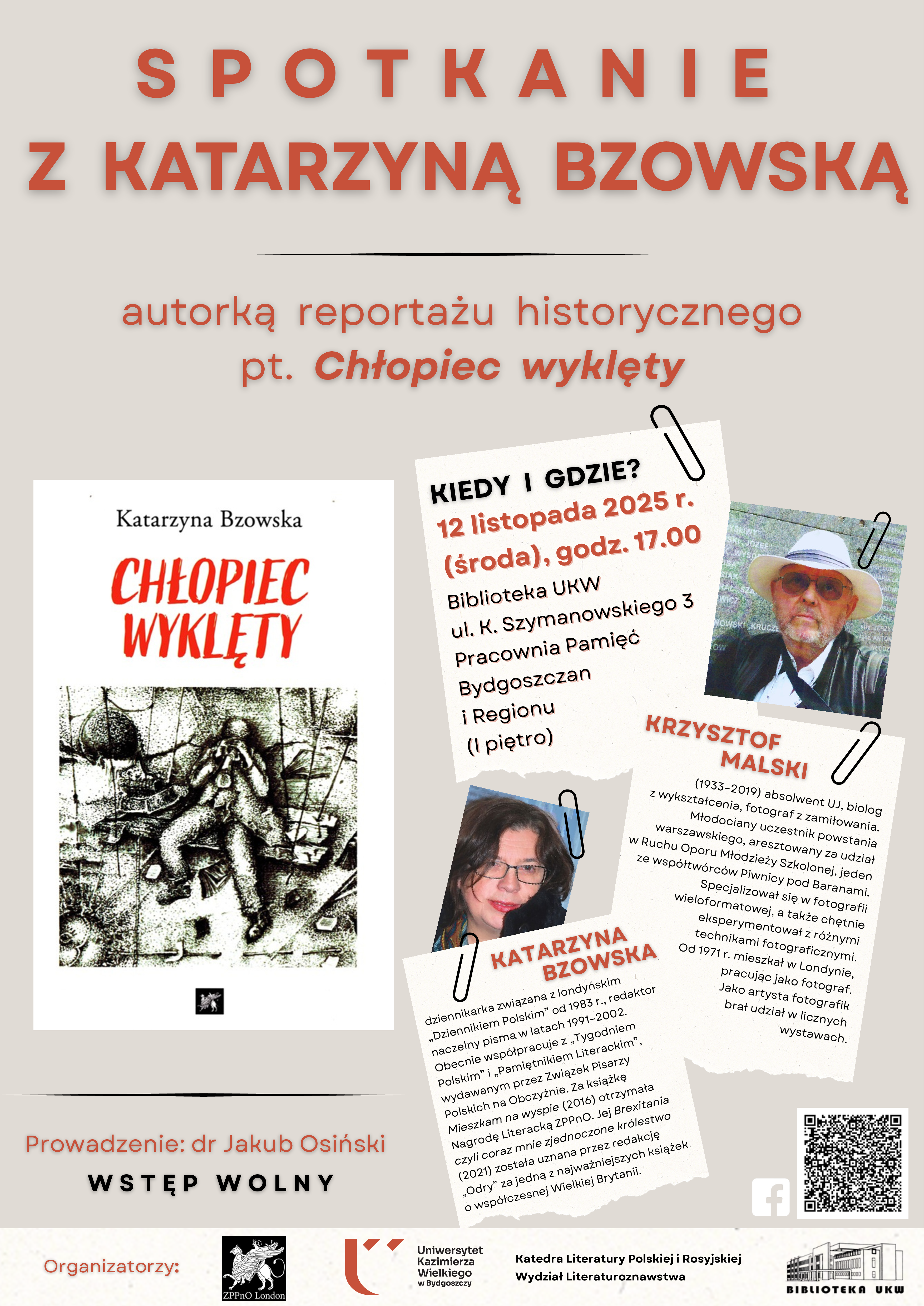 W środę, 12 listopada, o godzinie 17:00 w Bibliotece Uniwersytetu Kazimierza Wielkiego w Bydgoszczy odbędzie się spotkanie z red. Katarzyną Bzowską.