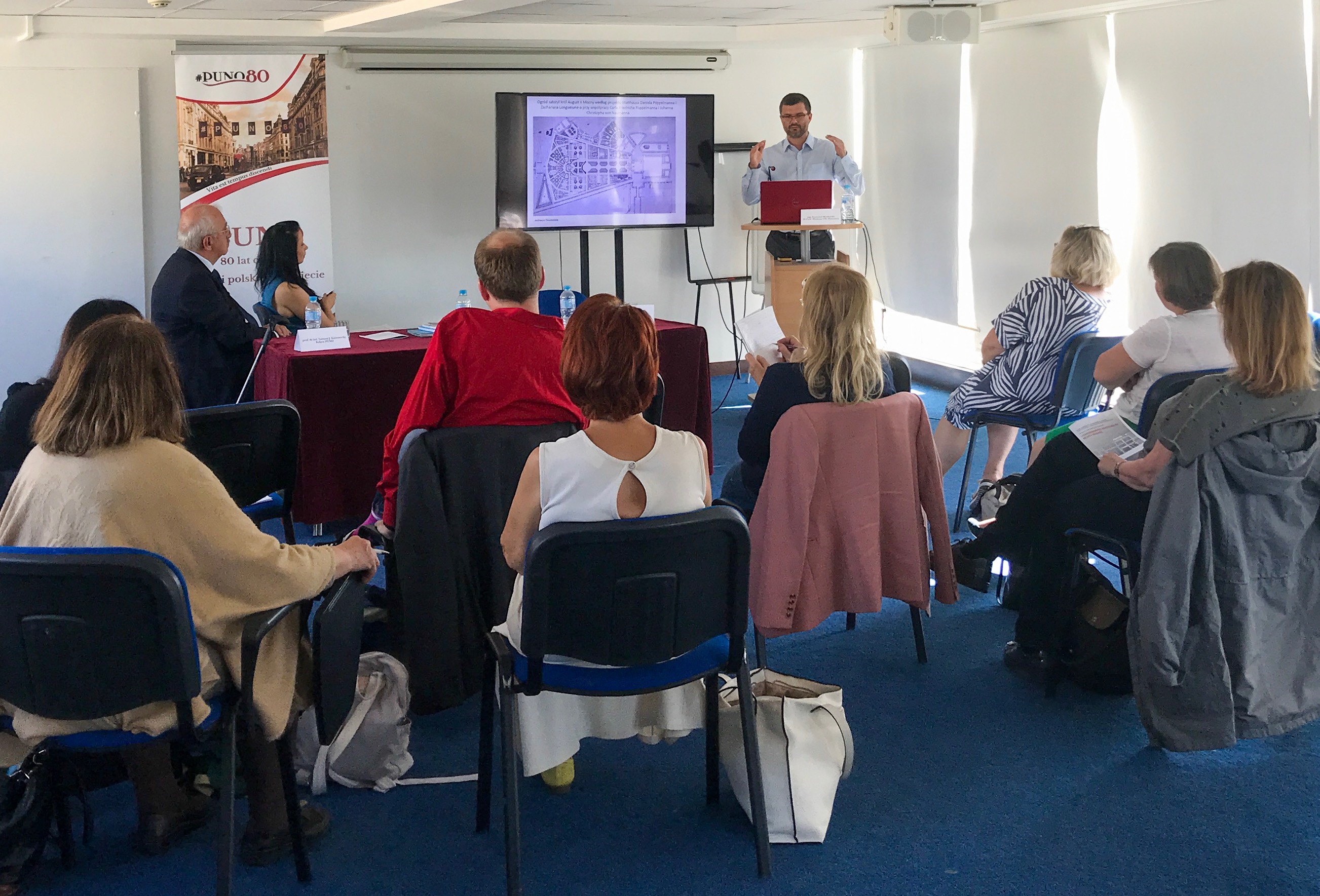 Dr Aleksandra Wójtowicz (kierownik projektu „Literaturoznawstwo architektoniczne”) przybliżyła następnie proponowaną przez nią formułę tytułowego „literaturoznawstwa architektonicznego”, rozumianego jako kolejny etap w ewolucji metod literaturoznawczych, poświęconych analizie przestrzeni. Czerpie ono z tradycyjnych badań nad przestrzenią w tekście literackim oraz z geokrytyki Westphala, jednak prowadzone prace mają inny – społeczny cel. Badania w takim podejściu poświęcone są rzeczywistej przestrzeni i jej literackiej (i szeroko rozumianej tekstowej) reprezentacji, jednak nie są prowadzone w celu poszerzenia interpretacji dzieła, ale wsparcia działań projektowych architektów i urbanistów. Dr Wójtowicz omówiła także sposób rozumienia „miejsc trudnych” – pojęcia wypracowanego przez międzydziedzinowy zespół, który w ramach trzyletniego grantu analizował przestrzeń warszawskich placów Piłsudskiego i Defilad. Prelegentka poruszyła niecodzienny problem płaszczyzn oraz schematów kompozycyjnych utrwalonych w świadomości jednostki, doświadczającej kontaktu z danym miejscem, które kształtują jej tożsamość narodową, a także utrwalają się w języku i sposobach reprezentacji.