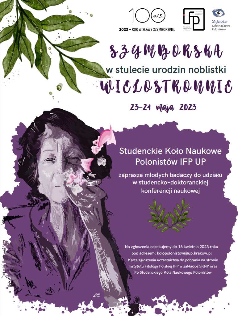Studenckie Koło Naukowe Polonistów Uniwersytetu Pedagogicznego im. KEN w Krakowie zaprasza do wzięcia udziału w studencko-doktoranckiej konferencji naukowej Szymborska wielostronnie. W stulecie urodzin noblistki, która odbędzie się w dn. 23-24 maja 2023 roku.