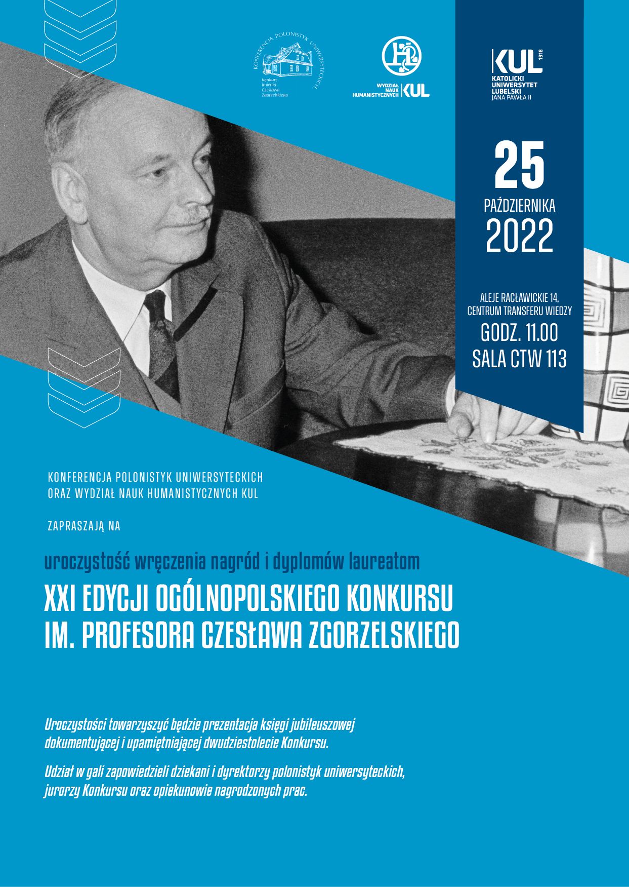 Ogólnopolski Konkurs im. Profesora Czesława Zgorzelskiego na najlepszą polonistyczną pracę magisterską jest inicjatywą Konferencji Polonistyk Uniwersyteckich, stanowiącą wyraz integracji środowiska polonistycznego i jego troski o poziom kształcenia. Patronuje mu wybitny uczony, badacz literatury polskiej, śp. Prof. Czesław Zgorzelski. Celem Konkursu jest wyróżnienie najzdolniejszych młodych polonistów i stworzenie bodźca do podejmowania przez nich dalszych prac naukowo-badawczych. Nagroda przyznawana jest w dwu kategoriach: językoznawczej i literaturoznawczej. Od jubileuszowej, dziesiątej, edycji jest to nagroda pierwszego i drugiego stopnia. Od tej edycji zainaugurowana została również seria wydawnicza „Młoda Polonistyka”, w ramach której (od 2012 r.) corocznie publikowane są magisteria uhonorowane pierwszą nagrodą w obu kategoriach. Tegorocznej uroczystości wręczenia nagród i dyplomów laureatom XXI Edycji Ogólnopolskiego Konkursu im. Profesora Czesława Zgorzelskiego towarzyszyć będzie prezentacja księgi jubileuszowej dokumentującej i upamiętniającej dwudziestolecie Konkursu. Wydarzenie odbędzie się na Katolickim Uniwersytecie Lubelskim 25 października 2022 r. o godzinie 11:00 w sali CTW 113.