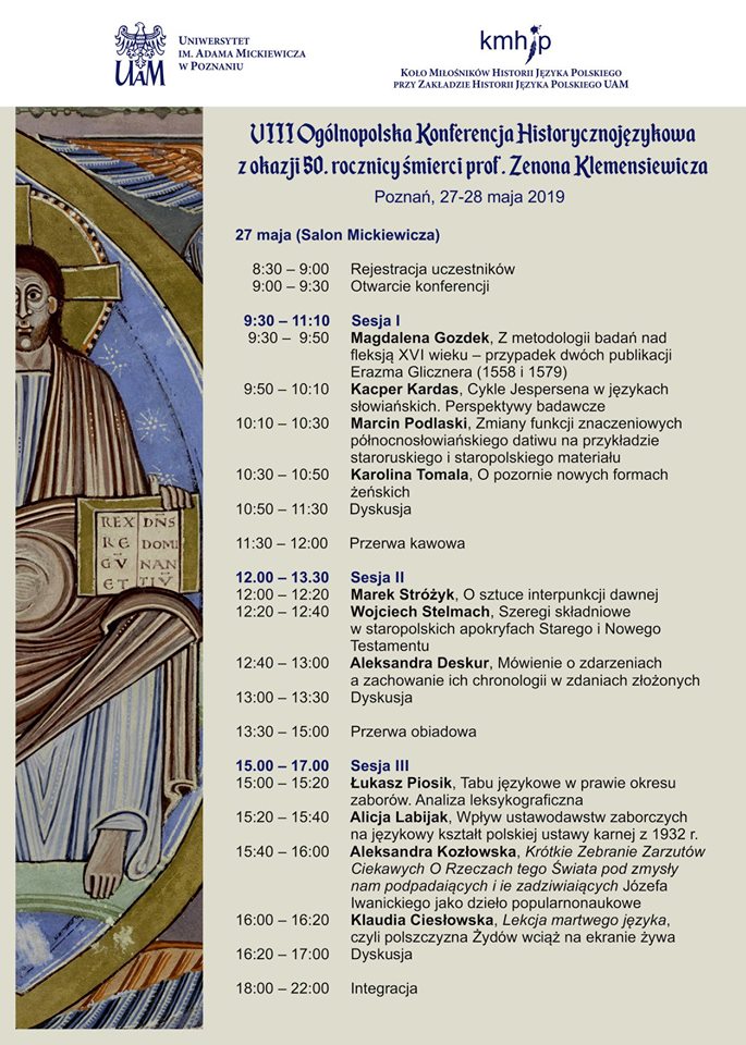 Koło Miłośników Historii Języka Polskiego działające przy Zakładzie Historii Języka Polskiego Uniwersytetu Adama Mickiewicza w Poznaniu ma przyjemność zaprosić na VIII Ogólnopolską Konferencję Historycznojęzykową z okazji 50. rocznicy śmierci prof. Zenona Klemensiewicza.