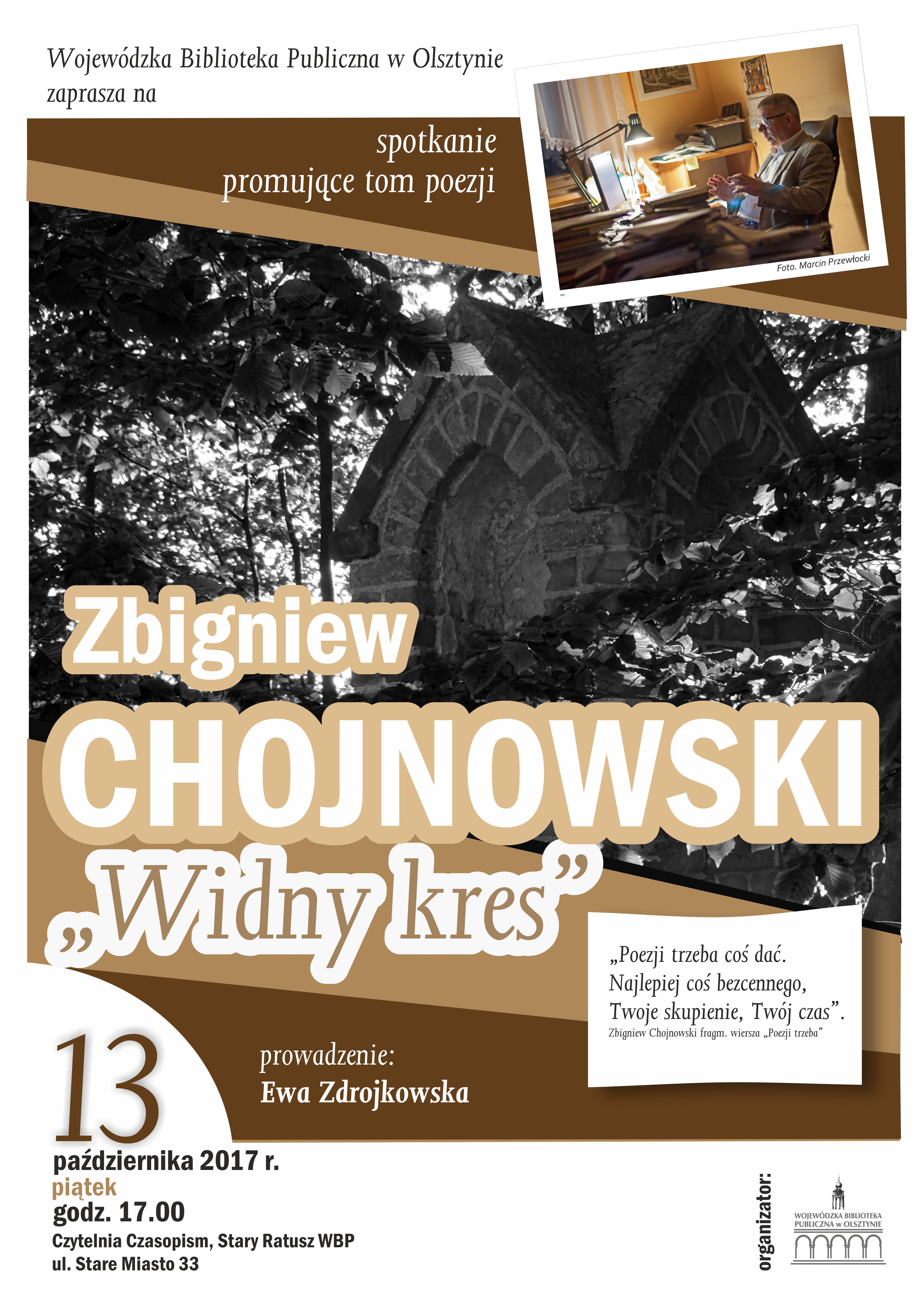 Wojewódzka Biblioteka Publiczna w Olsztynie zaprasza na spotkanie autorskie promujące tom poezji prof. Zbigniewa Chojnowskiego Widny kres (13 października 2017, godz. 17.00).