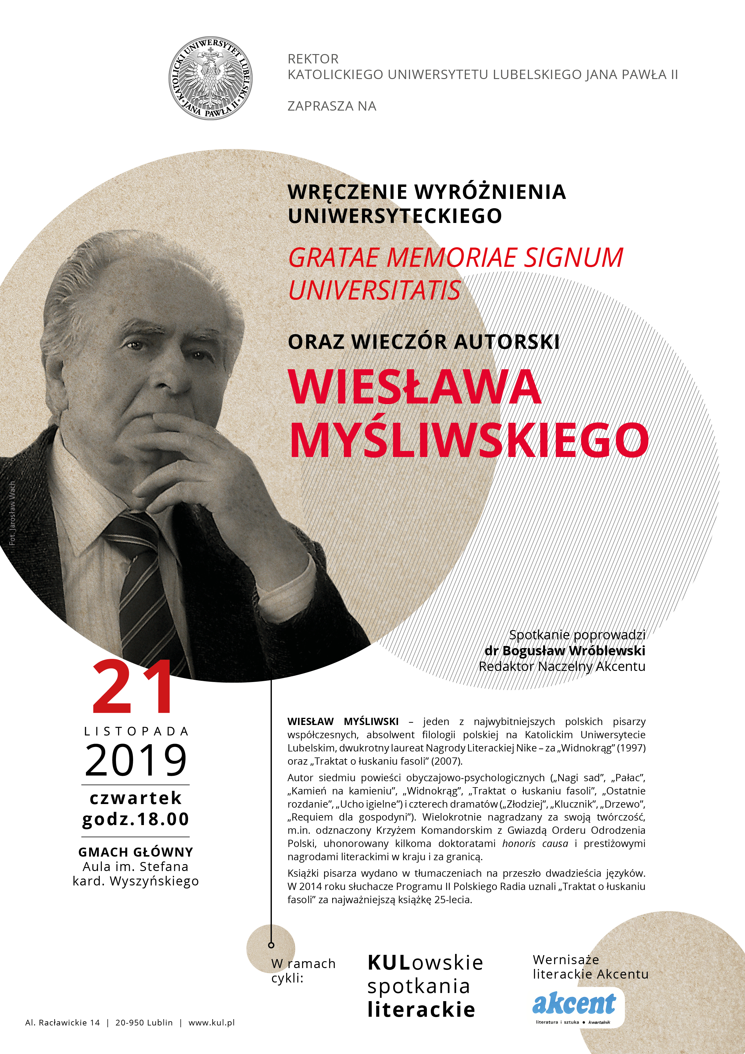 21 listopada 2019 r. KUL będzie gościł jednego z najwybitniejszych polskich pisarzy współczesnych oraz absolwenta uniwersytetu – Wiesława Myśliwskiego. O godz. 18.00 w Auli im. Stefana kard. Wyszyńskiego w ramach KULowskich spotkań literackich oraz wernisaży literackich „Akcentu” odbędzie się wieczór autorski. Spotkanie poprowadzi redaktor naczelny „Akcentu” dr Bogusław Wróblewski.Wcześniej odbędzie się uroczystość nadania pisarzowi jednego najwyższych uniwersyteckich wyróżnień – „Gratae Memoriae Signum Universitatis" .