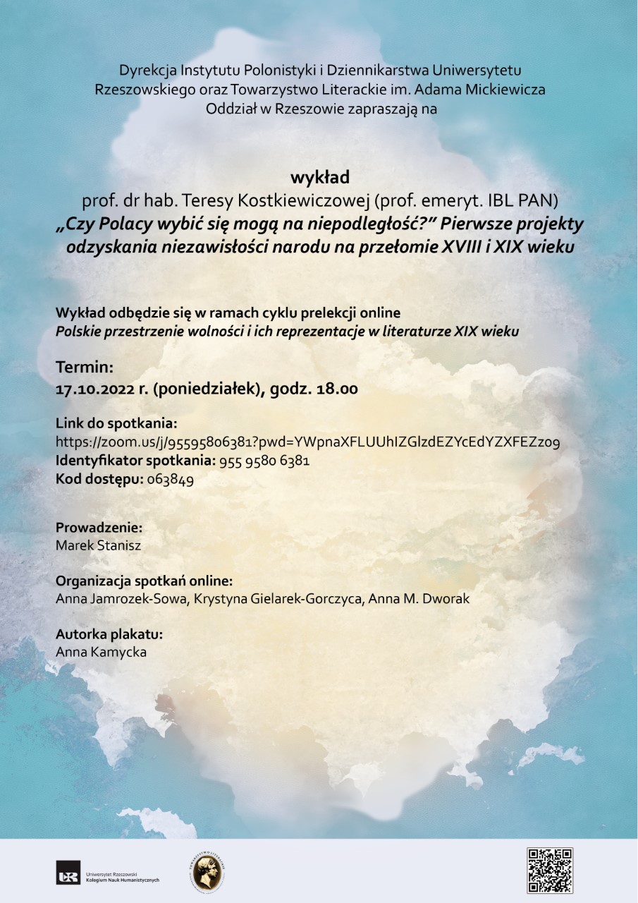 Dyrekcja Instytutu Polonistyki i Dziennikarstwa Uniwersytetu Rzeszowskiego oraz Towarzystwo Literackie im. Adama Mickiewicza Oddział w Rzeszowie zapraszają na wykład prof. dr hab. Teresy Kostkiewiczowej (prof. emeryt. IBL PAN) „Czy Polacy wybić się mogą na niepodległość?” Pierwsze projekty odzyskania niezawisłości narodu na przełomie XVIII i XIX wieku.