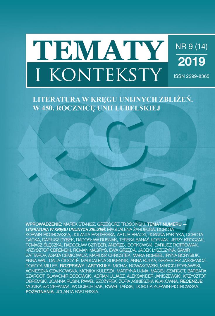 W przypadającą w 2019 roku 450. rocznicę podpisania Unii Lubelskiej redakcja „Tematów i Kontekstów” zaprosiła badaczki i badaczy różnych specjalności (zwłaszcza reprezentujących środowiska literaturoznawcze i kulturoznawcze, zróżnicowane metodologicznie, skupione na różnorodnych obszarach dziejów literatury) do refleksji nad obecnością w szeroko rozumianym piśmiennictwie tematu historycznych i współczesnych unii oraz towarzyszących im problemów. Uwagę dyskutantów skierowaliśmy zwłaszcza na literackie świadectwa „unijnych zbliżeń” – dawniej i dziś. Podjęliśmy tę kwestię w czasie szczególnym, z pełną świadomością jej aktualności, gdy różne aspekty unijnego kształtu Europy (i polskiego w niej uczestnictwa) są tak szeroko dyskutowane. Nasza debata ma jednak charakter naukowy, zgodny z formułą pisma, a jej celem jest stworzenie ram dla pogłębionego i bezstronnego namysłu nad rolą literatury i kultury w dziejowych procesach. (fragment wprowadzenia do numeru)
