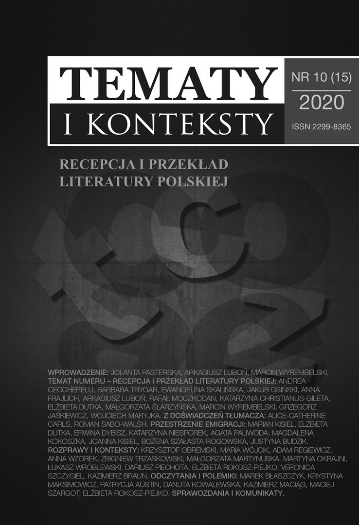 Okres, w którym trwały prace nad przygotowaniem do druku dziesiątego numeru „Tematów i Kontekstów”, okazał się czasem szczególnie intensywnego powrotu do debat i refleksji nad rolą i pozycją polskiej literatury w świecie współczesnym. Wzrost poczytności pisarstwa Olgi Tokarczuk, uhonorowanej w czwartym kwartale 2019 roku Nagrodą Nobla w dziedzinie literatury, zmotywował czytelników, krytyków, publicystów i literaturoznawców do dalszych dyskusji zarówno nad twórczością samej autorki, jak i nad sytuacją literatury polskiej na arenie międzynarodowej; nad mechanizmami jej udostępniania, recepcji i promocji poza krajem. Talent i kompetencje tłumaczy oraz mecenasów dzieł Tokarczuk nie pozostają bowiem bez wydatnego wpływu na zasięg oddziaływania jej prozy i rozpoznawalność jej nazwiska wśród zagranicznych odbiorców. Odnotowując ten oczywisty fakt, warto zauważyć, że wiedza o niebłahej randze sztuki translatorskiej w procesie transmitowania istotnych tekstów kultury została w ostatnich latach znacznie spopularyzowana – o czym casus noblistki wymownie świadczy [fragment wprowadzenia do numeru]
