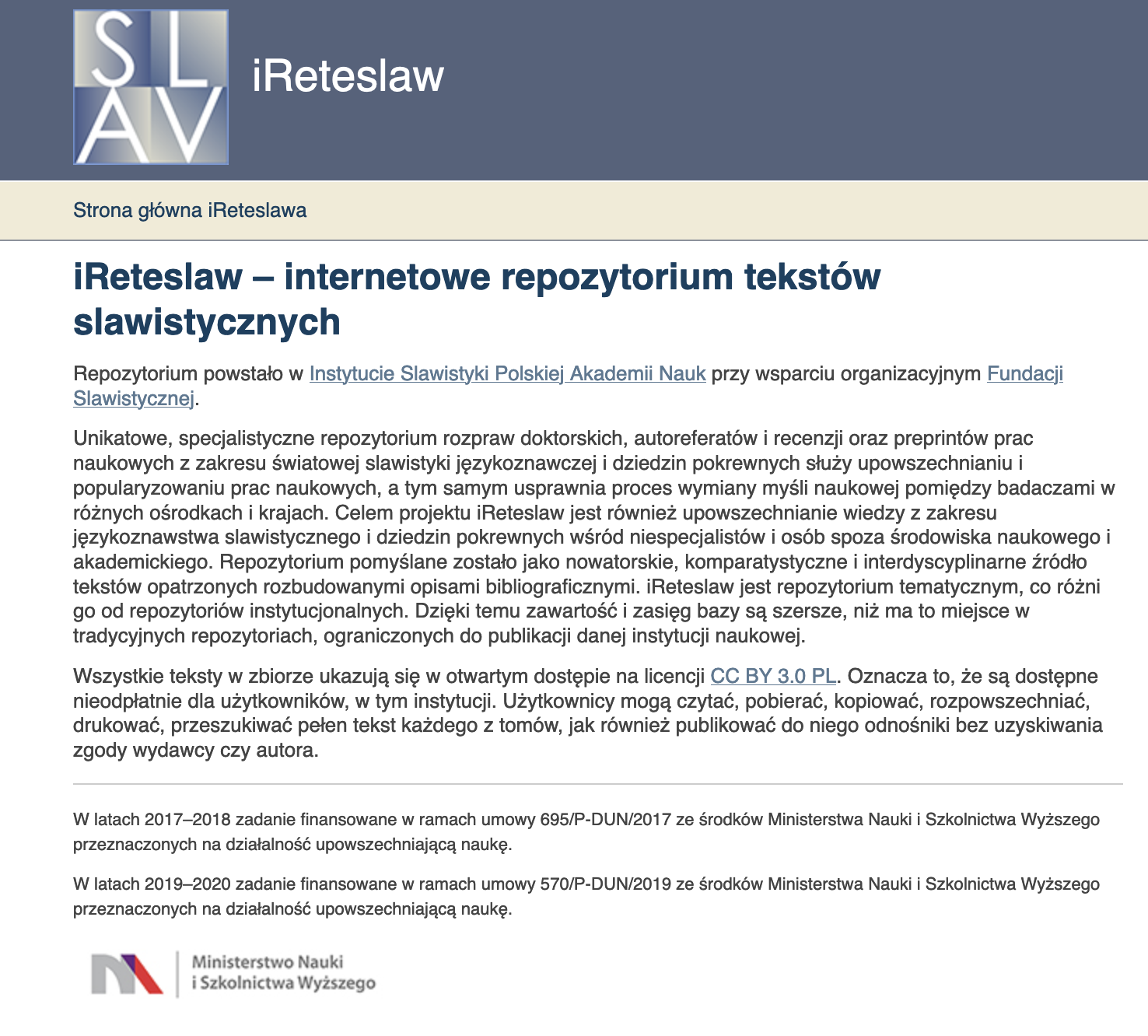 Repozytorium rozpraw doktorskich, autoreferatów i recenzji prac doktorskich oraz preprintów innych typów prac naukowych z zakresu światowej slawistyki językoznawczej i dziedzin pokrewnych iReteslaw ma na celu upowszechnianie i popularyzowanie prac naukowych, a tym samym usprawnianie procesu wymiany myśli naukowej pomiędzy badaczami z różnych dziedzin w różnych ośrodkach i krajach.