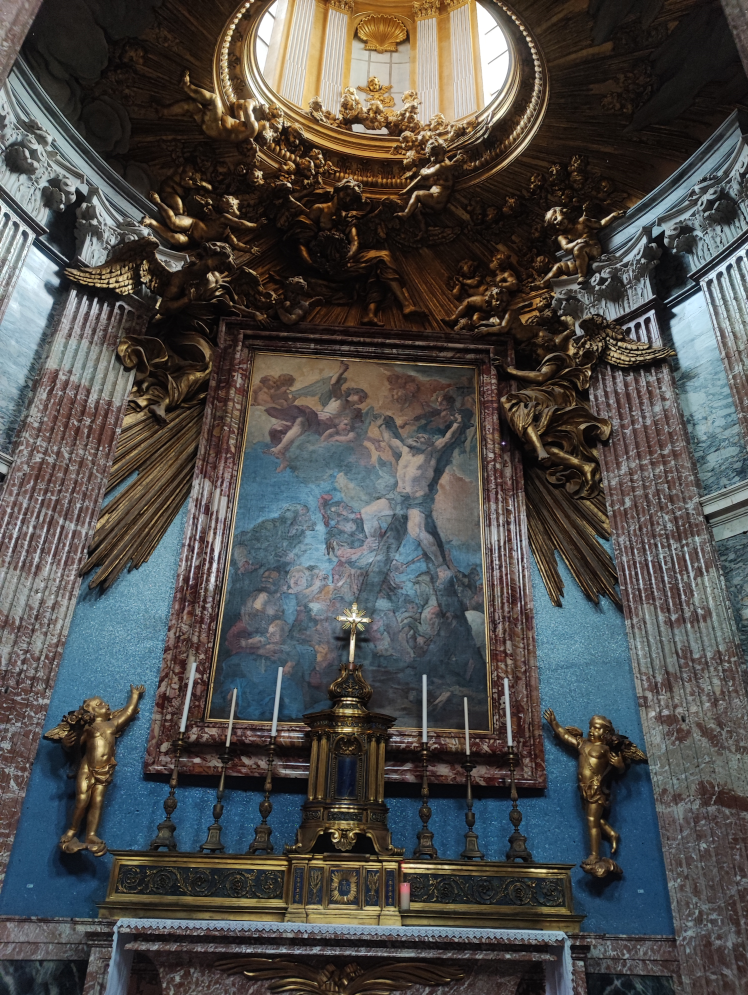 Zdjęcie to przedstawia ołtarz główny w kościele św. Andrzeja na Kwirynale. Umieszczony jest tu obraz, ukazujący rozpiętego na krzyżu św. Andrzeja, który zwraca swoje spojrzenie ku padającemu z niewidocznego źródła światłu. Nad obrazem jest mnóstwo złoconych aniołków i figura unoszącego się do nieba św. Andrzeja. Wydaje się, że zmierza on w kierunku oświetlonej kopuły, która może być namiastką nieba. Wnętrze tej przepięknej świątyni barokowej utrzymane jest w kolorystyce brudnego różu, szarości, złota i bieli z elementami błękitu. Jest to jeden z najpiękniejszych kościołów, jakie kiedykolwiek widziałam. Jednak główną przyczyną, dlaczego z zapartym tchem oglądałam tę świątynię, był fakt, że właśnie tu znajduje się kaplica św. Stanisława Kostki. Na Litwie ukończyłam gimnazjum, które nosi imię właśnie tego świętego. Dla mnie to było największe przeżycie być w tym samym miejscu, gdzie żył i dokonał swego ziemskiego żywota patron mojej szkoły.