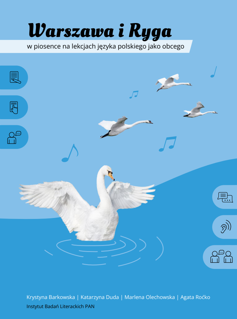 Warszawa i Ryga w piosence na lekcjach języka polskiego jako obcego to materiały edukacyjne z ćwiczeniami rozwijającymi sprawność rozumienia ze słuchu oraz umiejętność pracy z tekstem poetyckim, adresowane do uczących się języka polskiego jako obcego, drugiego i odziedziczonego, którzy opanowali polski alfabet oraz reprezentują poziomy biegłości językowej od A1 do C1 w skali Europejskiego systemu opisu kształcenia językowego (ESOKJ).