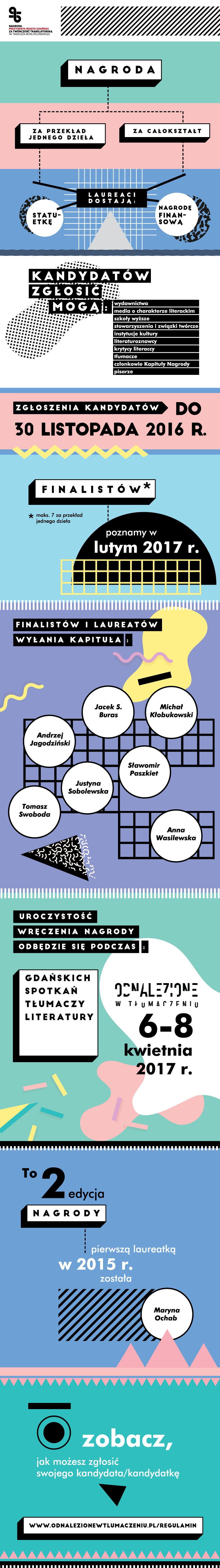 - Laureatów Nagrody poznamy podczas Gdańskich Spotkań Tłumaczy Literatury „Odnalezione w tłumaczeniu”, które odbędą się w dniach 6-8 kwietnia 2017 r. w Gdańsku.