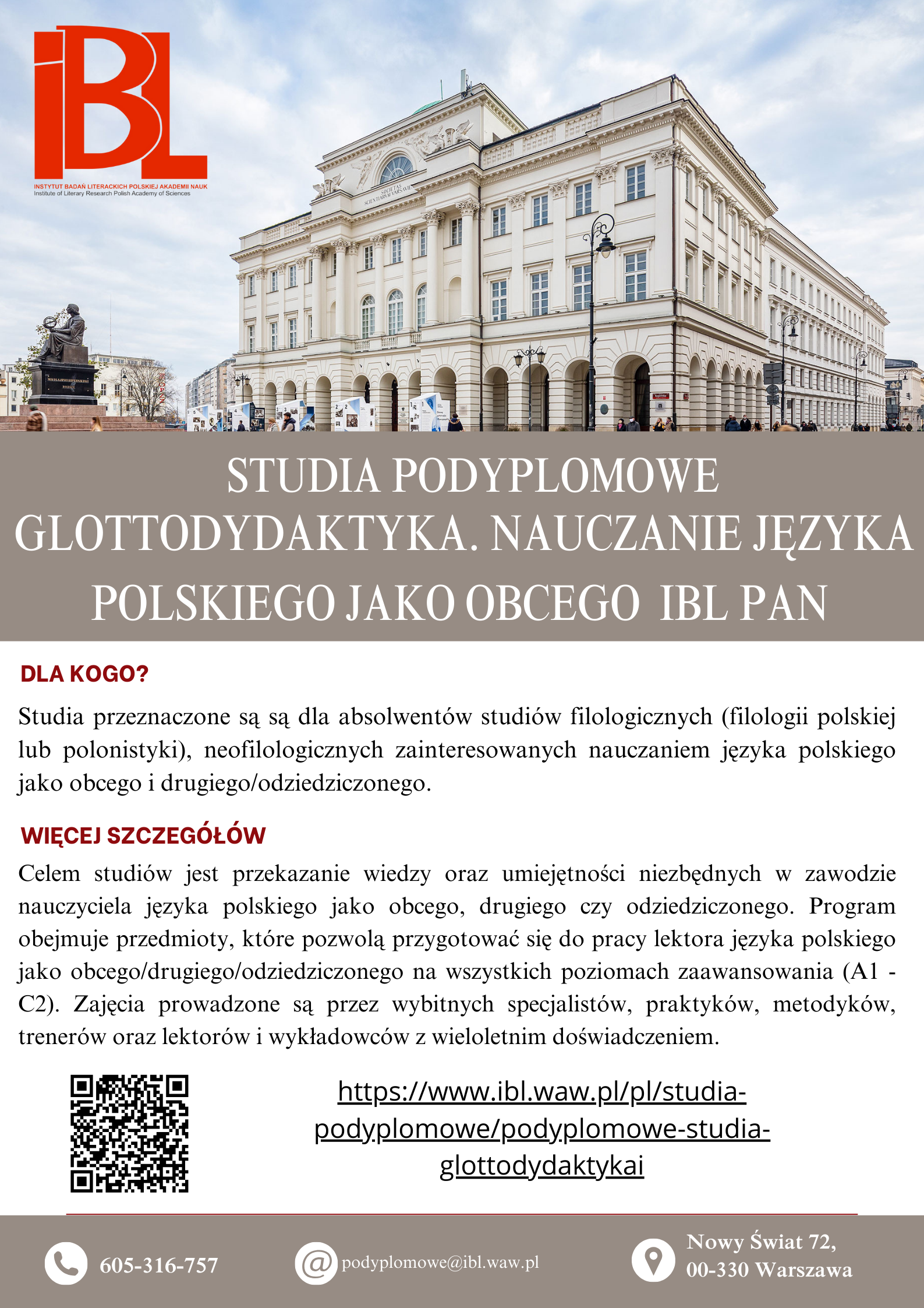 Więcej: https://www.ibl.waw.pl/pl/studia-podyplomowe/podyplomowe-studia-glottodydaktyka