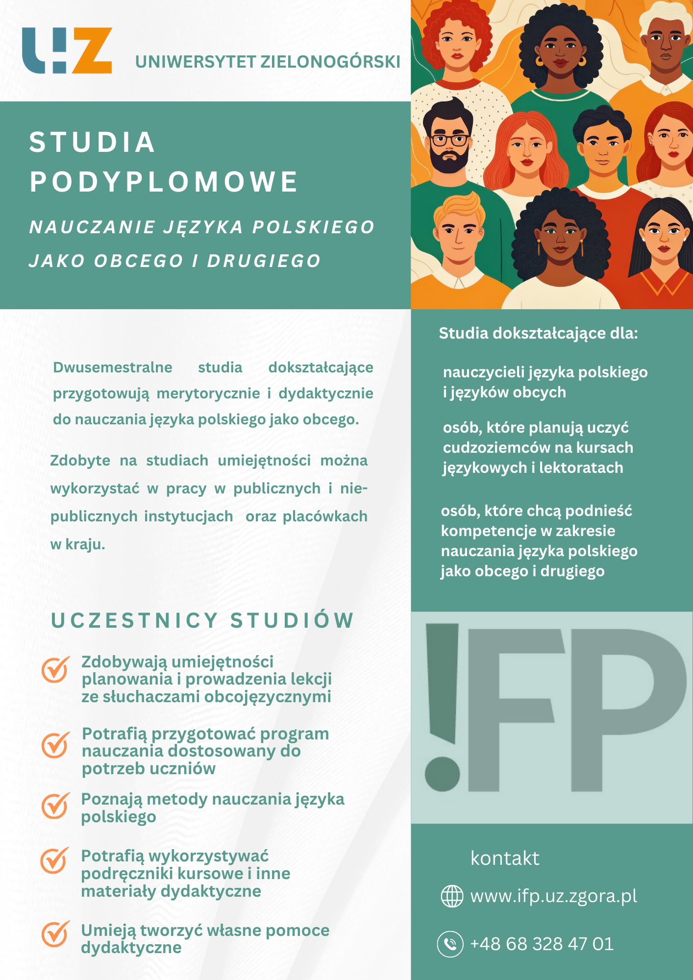 Oferta studiów podyplomowych jest skierowana do nauczycieli, którzy prowadzą zajęcia z języka polskiego jako obcego z cudzoziemcami w polskich szkołach i chcą poszerzyć umiejętności nauczania języka polskiego jako obcego i drugiego. Adresatem studiów są także osoby, które planują uczyć cudzoziemców w szkołach, na kursach językowych, lektoratach w niepublicznych placówkach edukacyjnych w kraju i za granicą, a także pasjonaci języka polskiego jako obcego. Program studiów został opracowany w taki sposób, aby słuchacze zdobyli umiejętności niezbędne do zaplanowania i przeprowadzenia zajęć ze słuchaczami obcojęzycznymi.