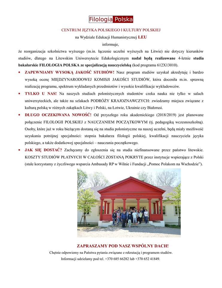 Centrum Języka Polskiego i Kultury Polskiej na Wydziale Edukacji Humanistycznej LEU informuje, że reorganizacja szkolnictwa wyższego (m.in. łączenie uczelni wyższych na Litwie) nie dotyczy kierunków studiów, dlatego na Litewskim Uniwersytecie Edukologicznym nadal będą realizowane 4-letnie studia bakalarskie FILOLOGIA POLSKA ze specjalizacją nauczycielską (kod programu 612X13010).