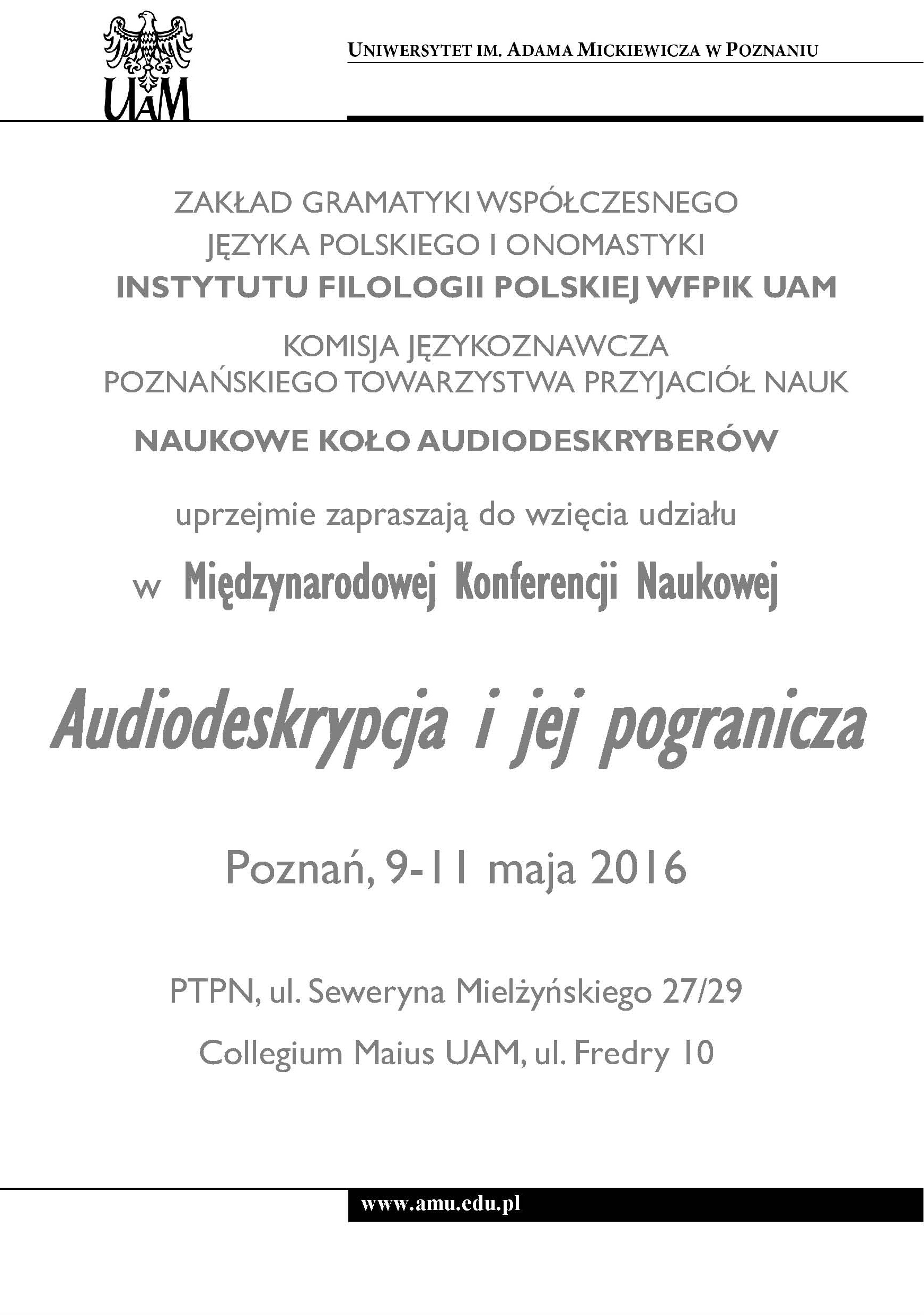 Zakład Gramatyki Współczesnego Języka Polskiego i Onomastyki IFP UAM, Poznańskie Towarzystwo Przyjaciół Nauk i Naukowe Koło Audiodeskryberów mają zaszczyt zaprosić na międzynarodową konferencję Audiodeskrypcja i jej pogranicza, która odbędzie się w dniach 9–11 maja 2016 r. na Wydziale Filologii Polskiej i Klasycznej UAM pod patronatem Jego Magnificencji Rektora Uniwersytetu im. Adama Mickiewicza w Poznaniu i Ministerstwa Cyfryzacji. Program konferencji w załączniku.