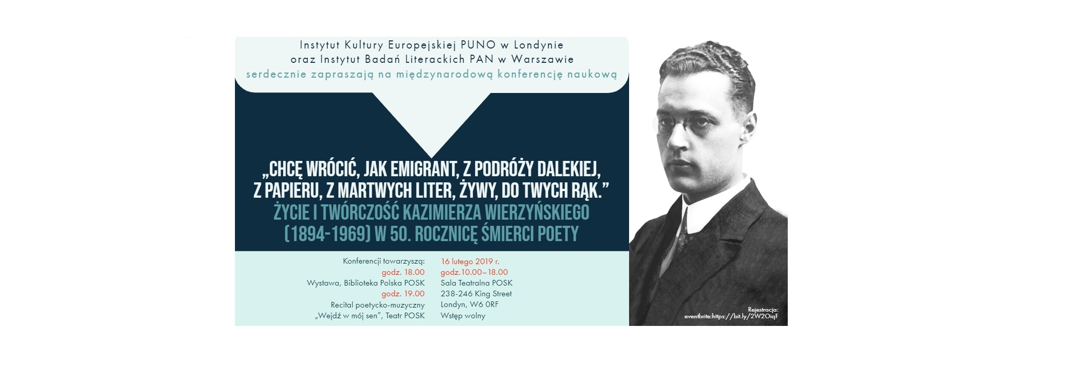 IBL PAN w Warszawie oraz IKE PUNO w Londynie serdecznie zapraszają na międzynarodową konferencję naukową poświęconą życiu i twórczości Kazimierza Wierzyńskiego w 50. rocznicę śmierci Poety.