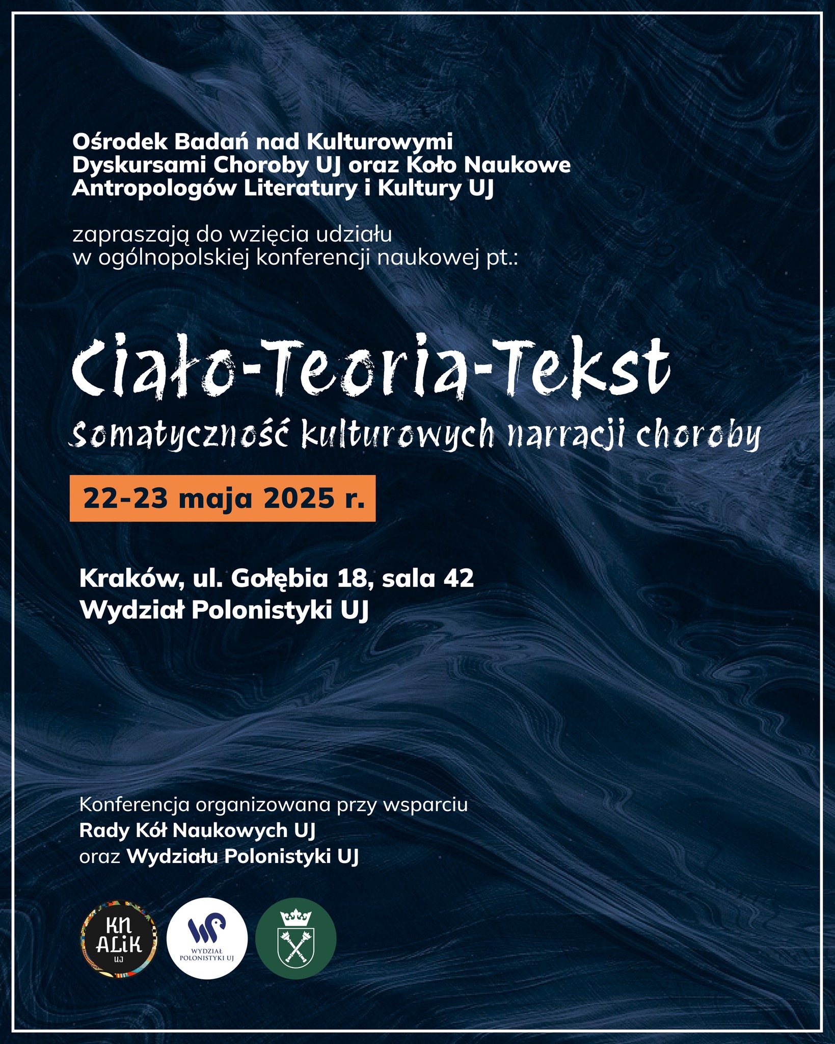 Koło Naukowe Antropologów Literatury i Kultury wraz z Katedrą Antropologii Literatury i Badań Kulturowych, Katedrą Teorii Literatury oraz Pracownią Badań Biografii i Autobiografii przy Wydziale Polonistyki Uniwersytetu Jagiellońskiego zapraszają do udziału w konferencji naukowej Chorobopisanie. Narracje maladyczne w literaturze i kulturze. Konferencja odbędzie się 25-26 maja 2023 roku, w formie stacjonarnej lub hybrydowej. Do udziału w konferencji zapraszamy studentów, doktorantów oraz pracowników naukowych.