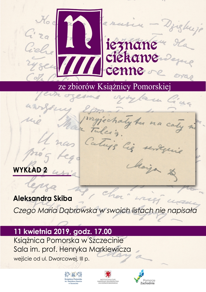 W zbiorach Książnicy można znaleźć kilkadziesiąt listów autorki Nocy i dni stanowiących korespondencję pisarki z zamieszkałymi w Choszcznie siostrą i siostrzenicą. Najwcześniejsze listy powstały przed II wojną światową, ostatnie w roku śmierci pisarki (1965). W trakcie wykładu zostaną zaprezentowane autografy listów i kart pocztowych.