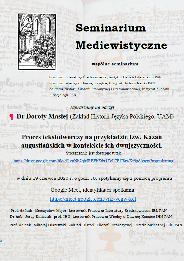 Pracownia Literatury Średniowiecza (Instytut Badań Literackich PAN), Pracownia Wiedzy o Dawnej Książce (Instytut Historii Nauki PAN) oraz Zakład Historii Filozofii Starożytnej i Średniowiecznej (Instytut Filozofii i Socjologii PAN) zapraszają na wspólne Spotkanie Mediewistyczne, które odbędzie się 19 czerwca 2020 o godz. 10. Odczyt wygłosi dr Dorota Masłej (Zakład Historii Języka Polskiego, Instytut Filologii Polskiej UAM).