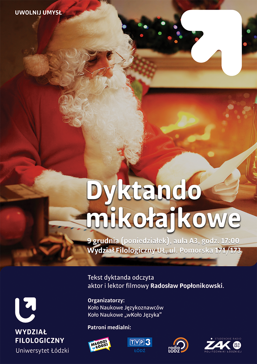Koło Naukowe Językoznawców działające przy Zakładzie Współczesnego Języka Polskiego UŁ oraz Koło Naukowe „wKoło Języka” działające przy Zakładzie Historii Języka Polskiego UŁ serdecznie zapraszają na dyktando mikołajkowe.