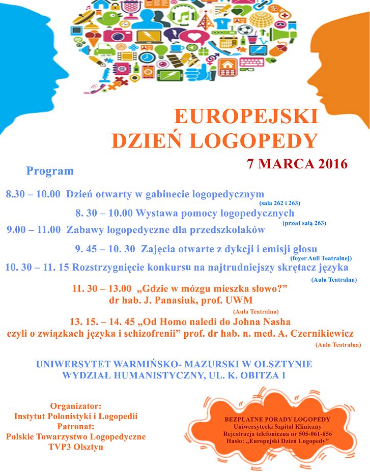 Instytut Polonistyki i Logopedii UWM w Olsztynie zaprasza na Europejski Dzień Logopedy.