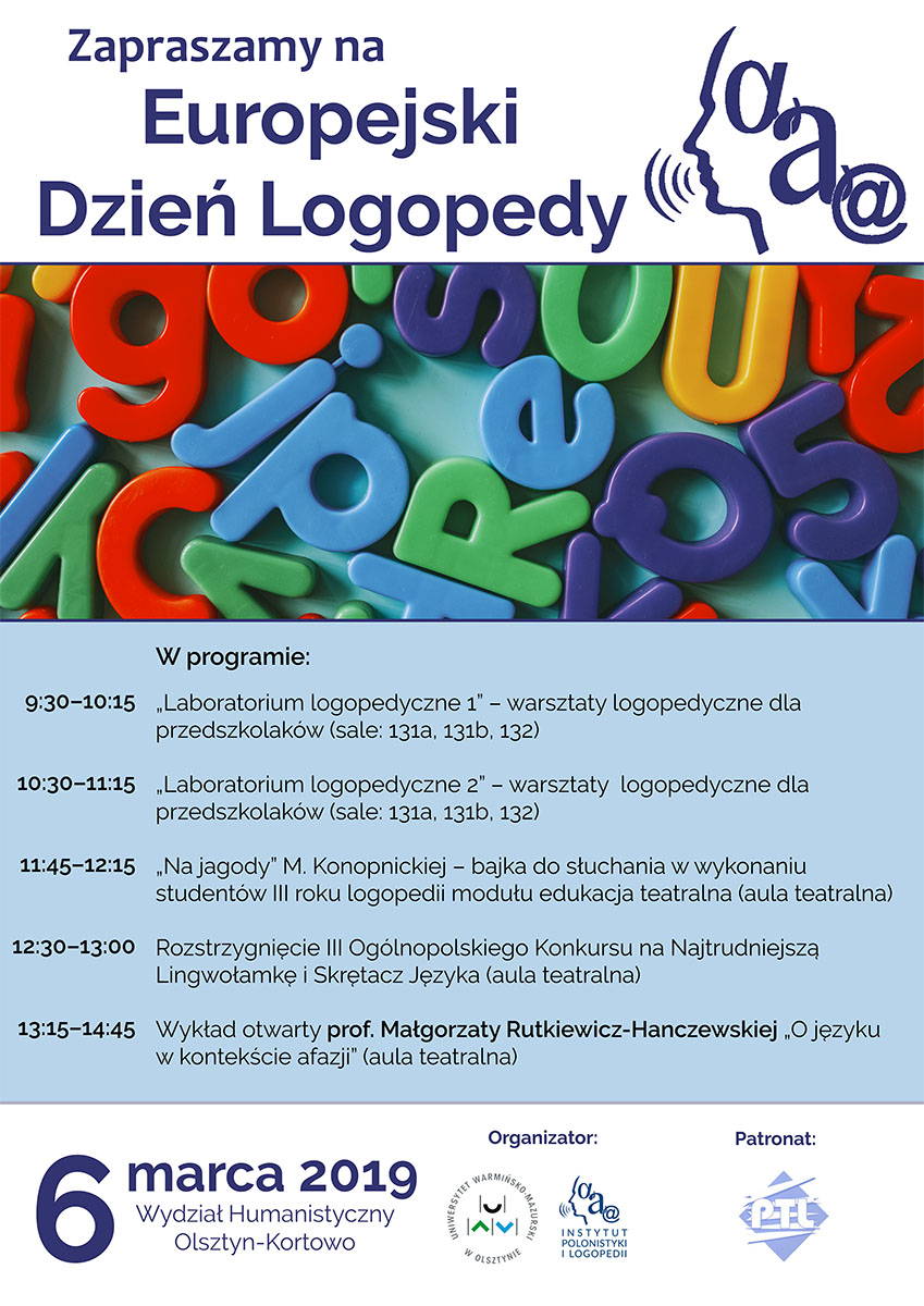 Zapraszamy na Europejski Dzień Logopedy, który odbędzie się na Wydziale Humanistycznym UWM w Olsztynie w dniu 06.03.2019 roku w godz. 9.30 - 14.45.