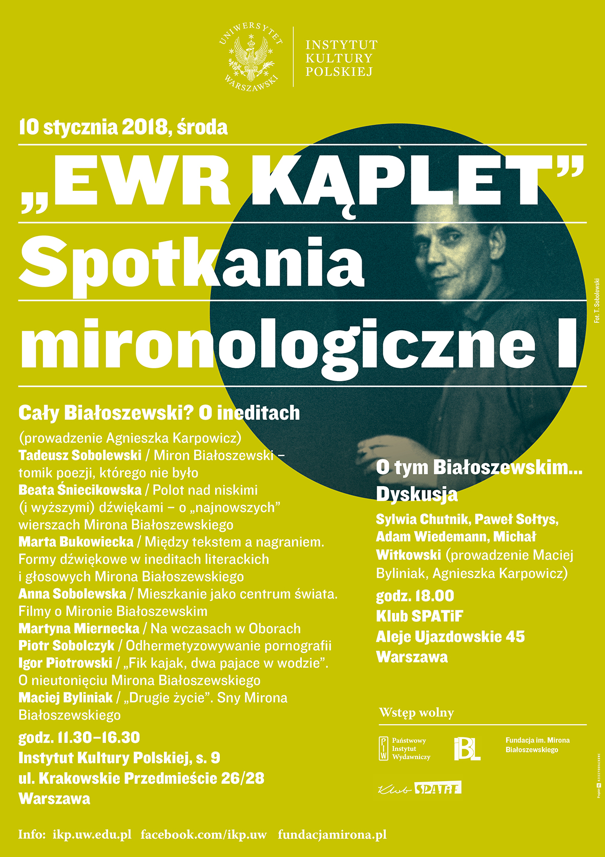 Fundacja im. Mirona Białoszewskiego, Instytut Badań Literackich PAN, Instytut Kultury Polskiej UW oraz Państwowy Instytut Wydawniczy serdecznie zapraszają na „Ewr kąplet”. Spotkania mironologiczne I, czyli na spotkanie związane z trzema ostatnimi tomami Utworów zebranych Mirona Białoszewskiego, wydanych nakładem PIW. Obejmuje ono sesję naukową i dyskusję z pisarzami. Odbędzie się 10 stycznia 2018 roku.