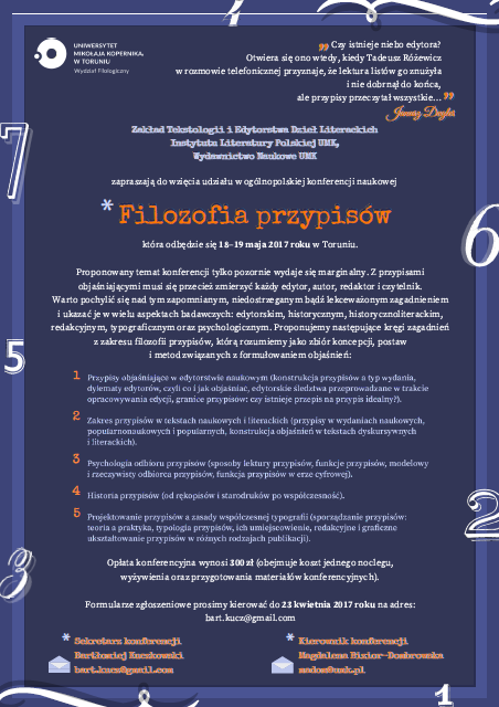 Zakład Tekstologii i Edytorstwa Dzieł Literackich UMK zaprasza do wzięcia udziału w ogólnopolskiej konferencji naukowej "Filozofia przypisów", która odbędzie się 18-19 maja 2017 roku na Wydziale Filologicznym UMK w Toruniu.