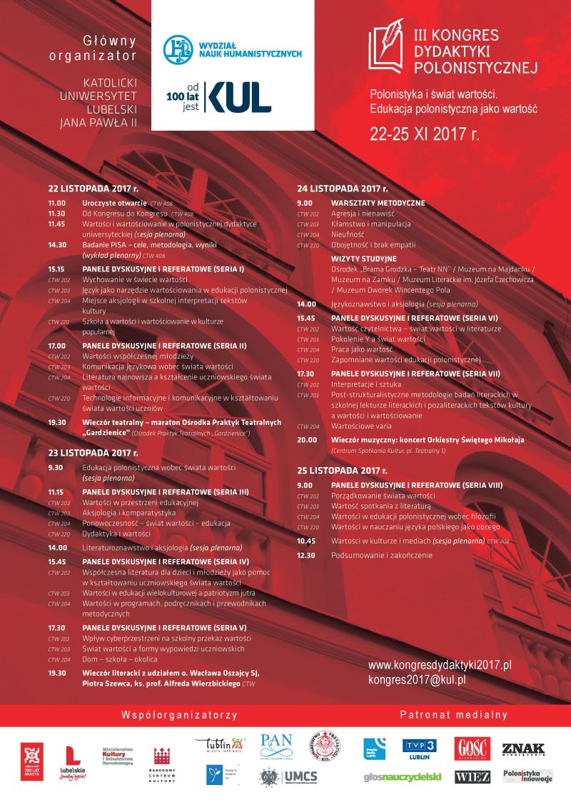 Katedra Dydaktyki Literatury i Języka Polskiego KUL oraz Miasto Lublin, Komitet Nauk o Literaturze Polskiej PAN, Towarzystwo Przyjaciół KUL i Uniwersytet Marii Curie Skłodowskiej w Lublinie zapraszają do udziału w III Kongresie Dydaktyki Polonistycznej, który odbędzie się w KUL w dniach 22-25 listopada 2017 r. Kongres będzie stanowił część obchodów 100-lecia KUL, a honorowy patronat nad nim objął Rektor KUL.
