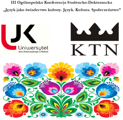 Studenckie Koło Naukowe Dialektologiczne Kieleckie Towarzystwo Naukowe oraz Instytut Filologii Polskiej Uniwersytetu Jana Kochanowskiego w Kielcach zapraszają na III ogólnopolską konferencję studencko-doktorancką "Język jako świadectwo kultury. Język. Kultura. Społeczeństwo"