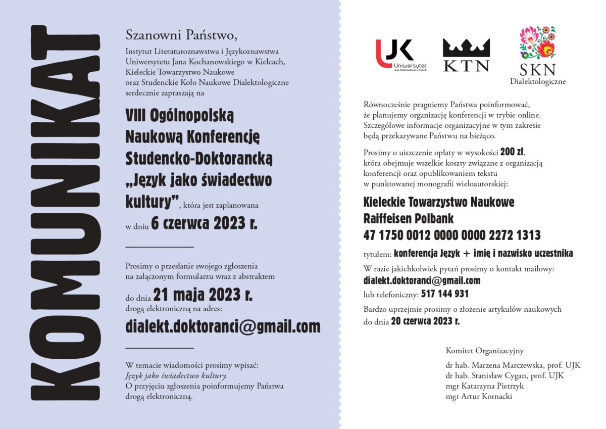 Instytut Literaturoznawstwa i Językoznawstwa Uniwersytetu Jana Kochanowskiego w Kielcach, Kieleckie Towarzystwo Naukowe, Studenckie Koło Naukowe Dialektologiczne mają zaszczyt zaprosić na IX Ogólnopolską Naukową Konferencję Studencko--Doktorancką Język jako świadectwo kultury
