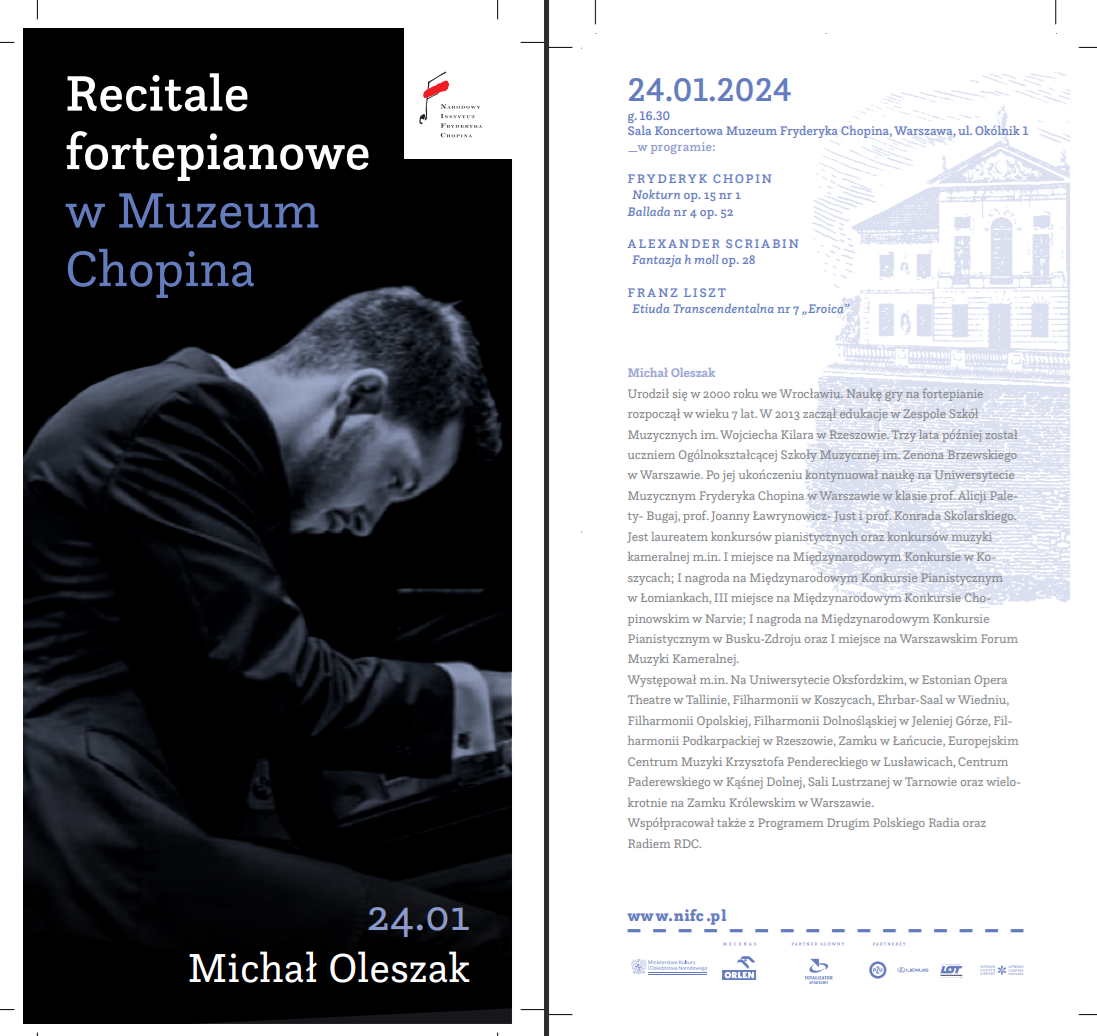 16.30-17.00 – Recital fortepianowy w Sali Koncertowej Muzeum Fryderyka Chopina (wykonawca: Michał Oleszak – laureat V nagrody na Ogólnopolskim Konkursie Chopinowskim)