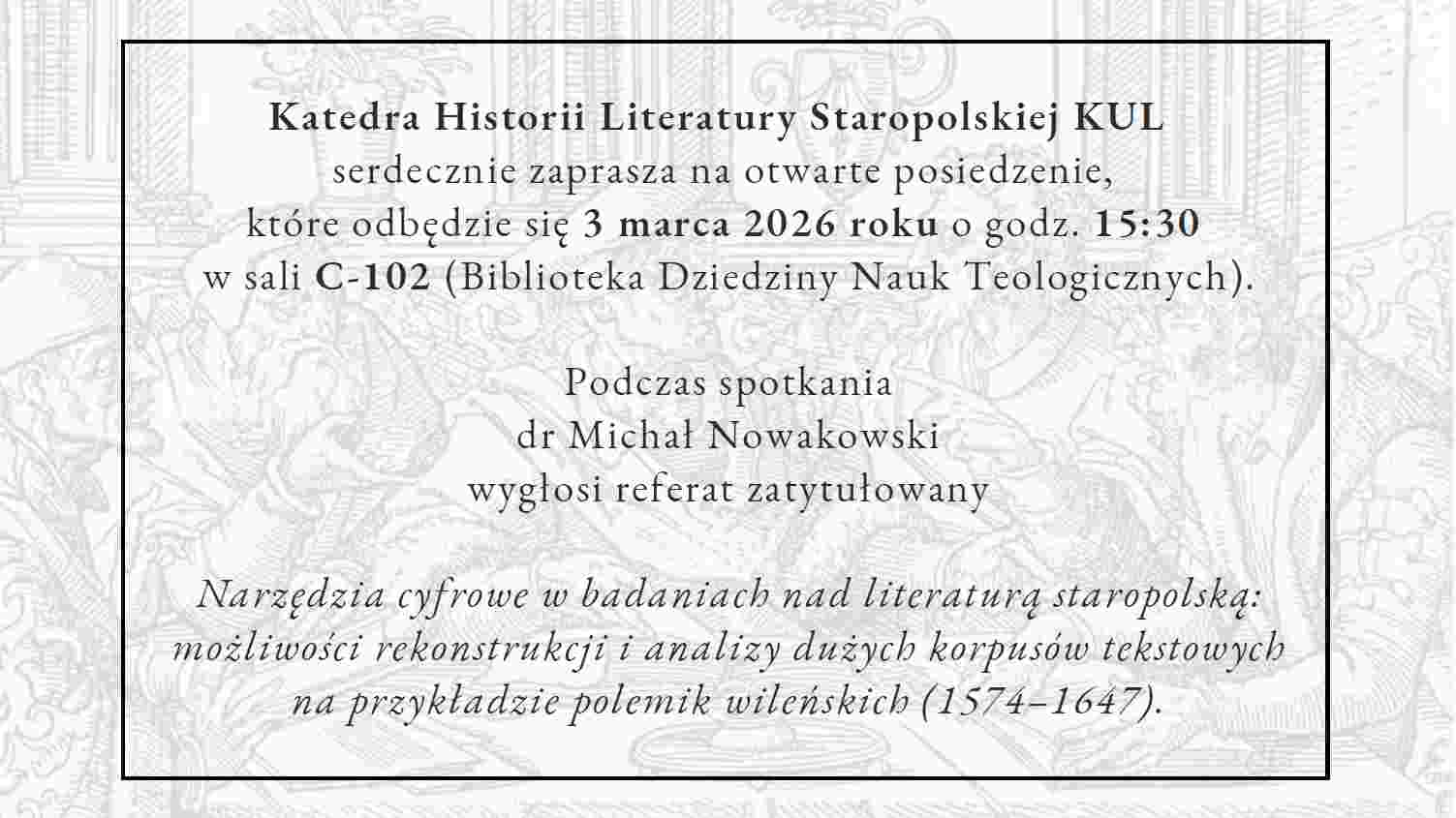 Katedra Historii Literatury Staropolskiej KUL zaprasza na otwarte posiedzenie, podczas którego dr Michał Nowakowski wygłosi referat pt. Narzędzia cyfrowe w badaniach nad literaturą staropolską: możliwości rekonstrukcji i analizy dużych korpusów tekstowych na przykładzie polemik wileńskich (1574-1647).