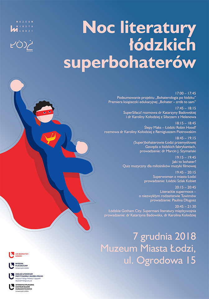 Interdyscyplinarne Centrum Badań Humanistycznych Uniwersytetu Łódzkiego zaprasza do Muzeum Miasta Łodzi, ul. Ogrodowa 15, w piątek 7 grudnia od godziny 17.00 na Noc literatury łódzkich superbohaterów.