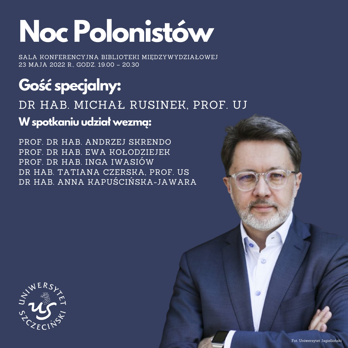 Wydział Humanistyczny Uniwersytetu Szczecińskiego zaprasza na Noc Polonistów, którą uświetni gość specjalny, prof. Michał Rusinek z Uniwersytetu Jagiellońskiego. W spotkaniu udział wezmą profesorowie szczecińskiej polonistyki: Andrzej Skrendo, Ewa Kołodziejek, Inga Iwasiów, Tatiana Czerska, Anna Kapuścińska-Jawara.